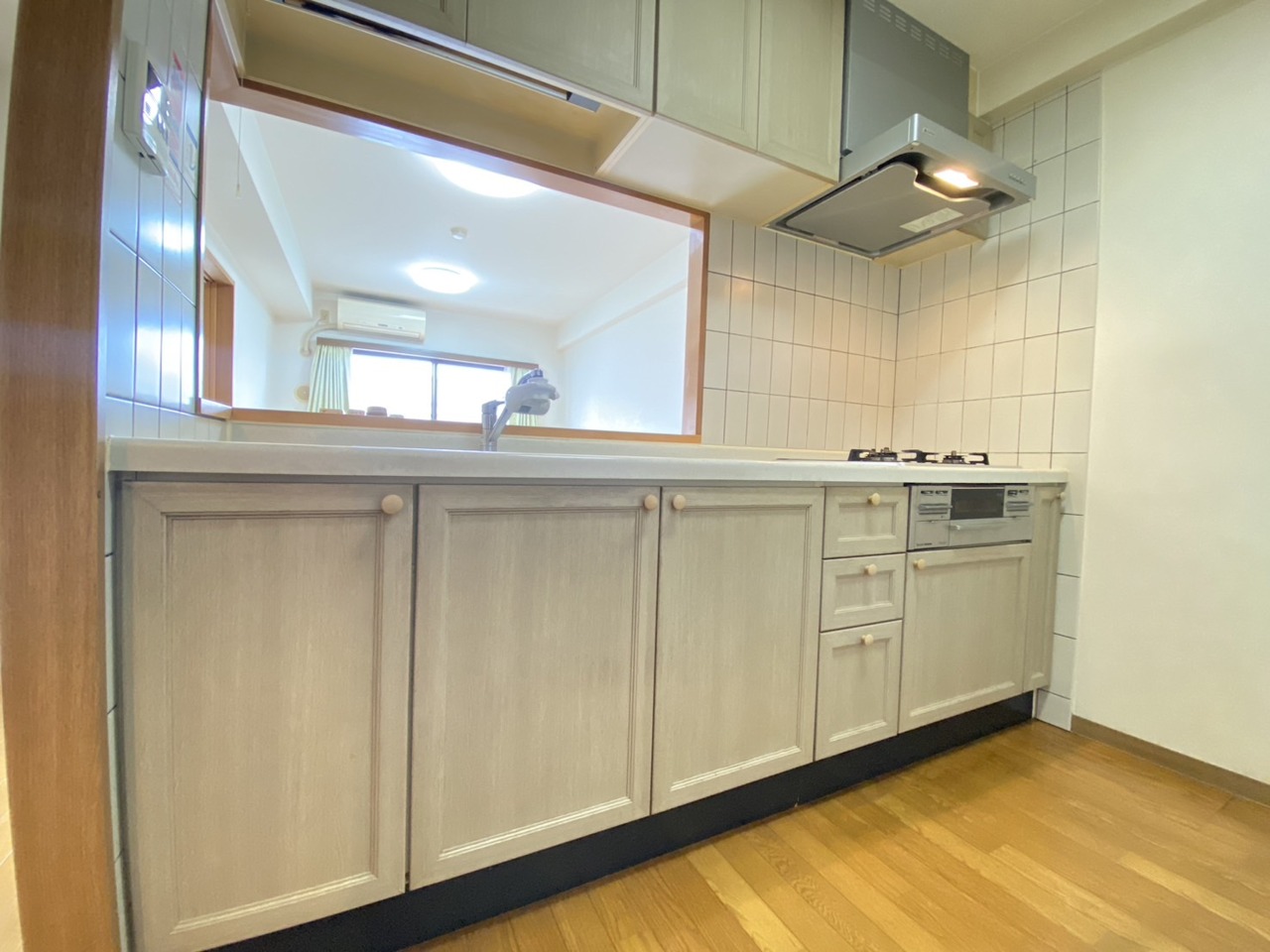 手を伸ばせばそこに収納が。安定した使用感の吊戸棚つきのキッチン空間。