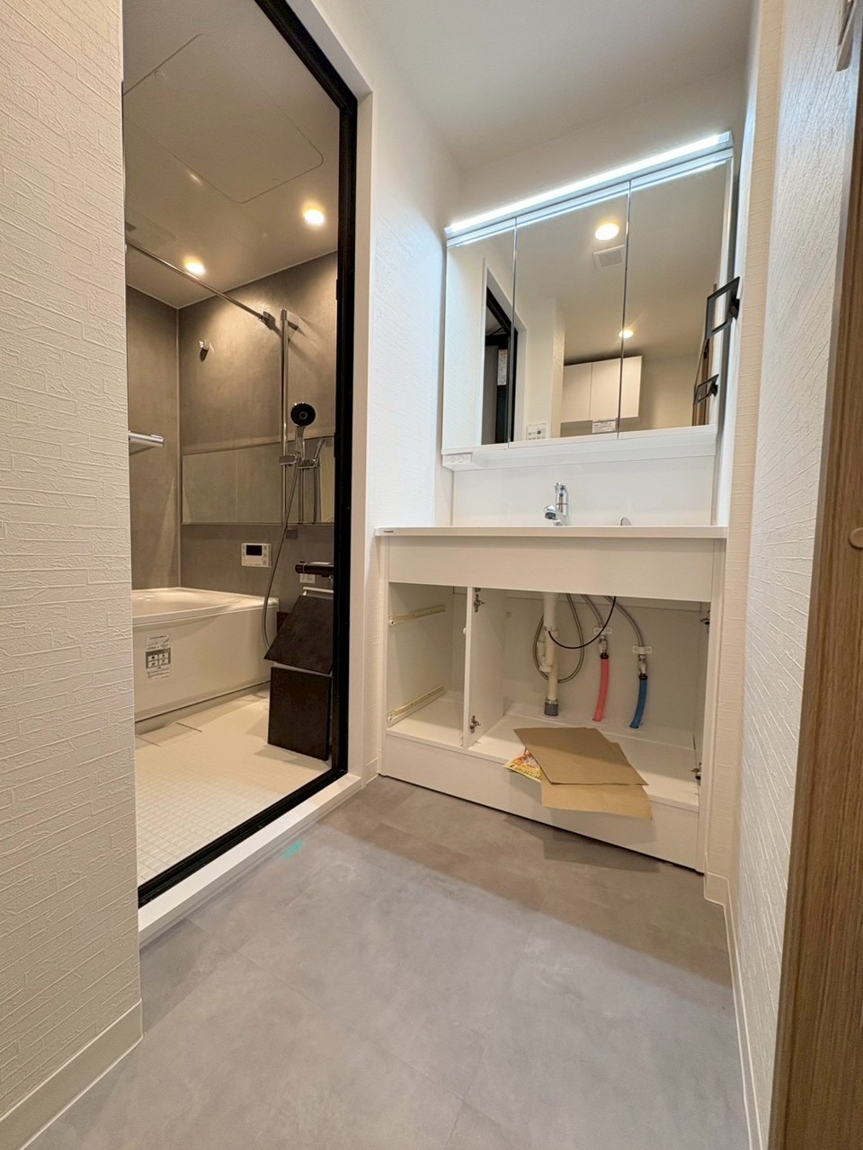 三面鏡に洗面台。 コンセントに照明機能、多機能性を備えた設備です。