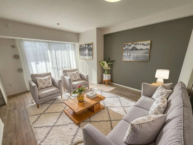 洋室はモダンなデザインと機能性を備え、快適な生活空間に。明るい窓から差し込む自然光が広々とした空間をさらに明るく開放的に感じさせます。