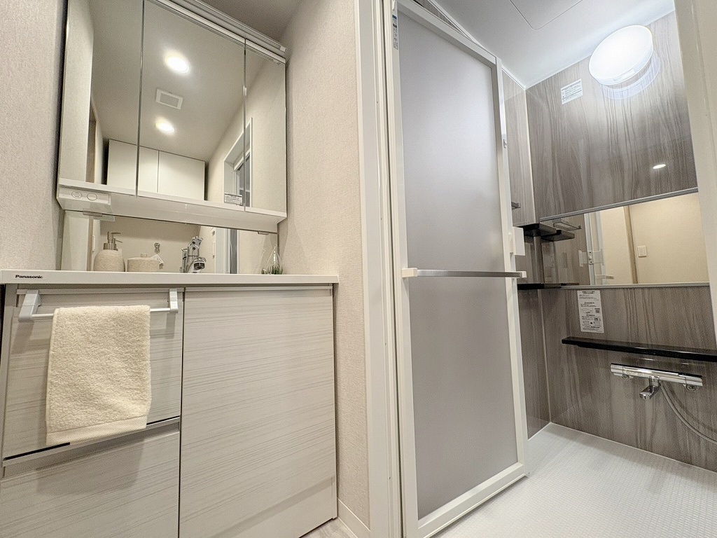 三面鏡に洗面台。 コンセントに照明機能、多機能性を備えた設備です。