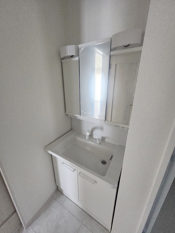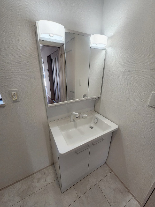 A号棟 三面鏡に洗面台。 コンセントに照明機能、多機能性を備えた設備です。