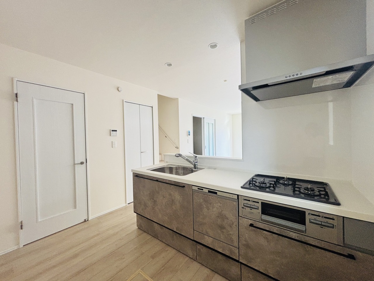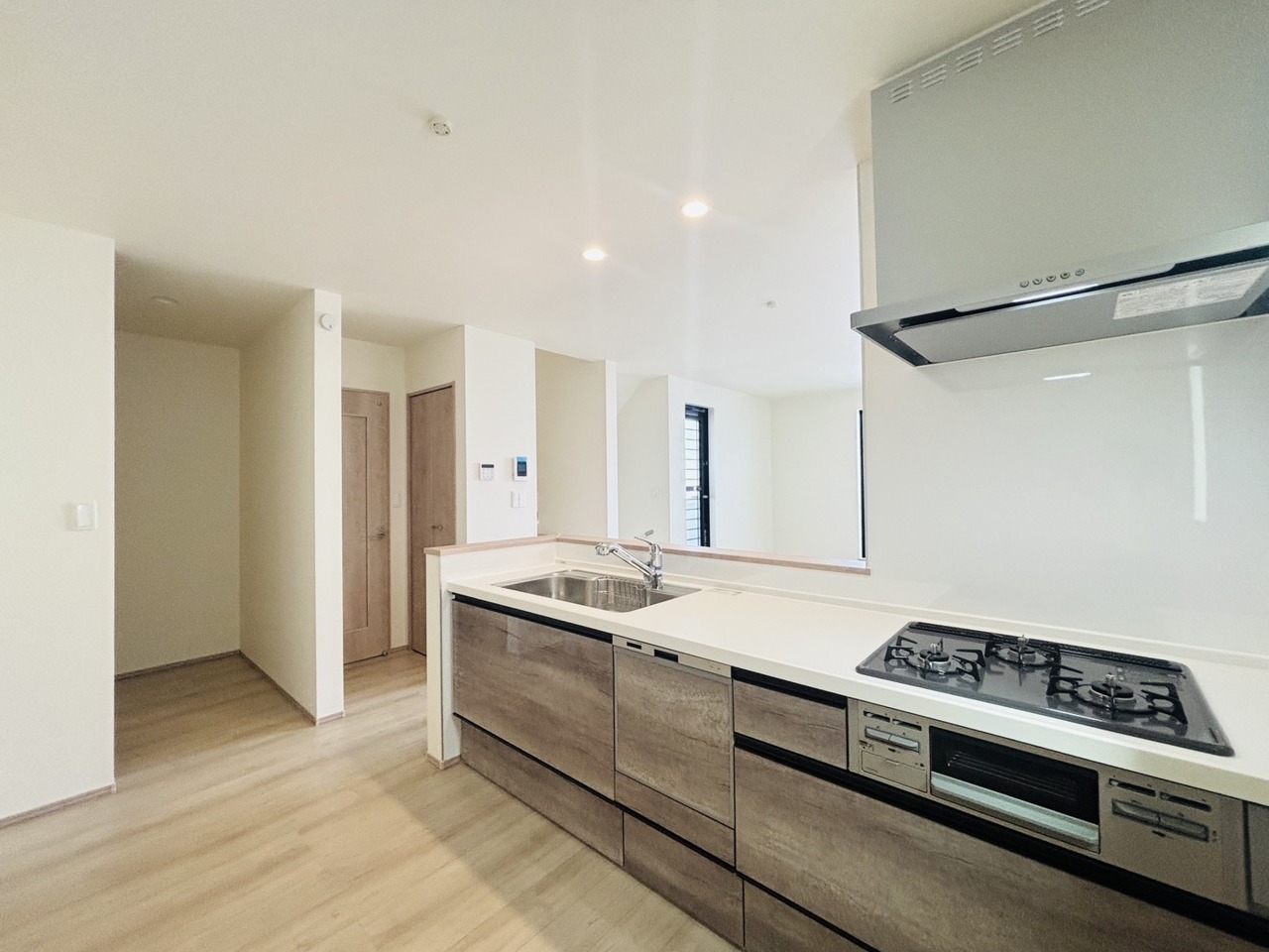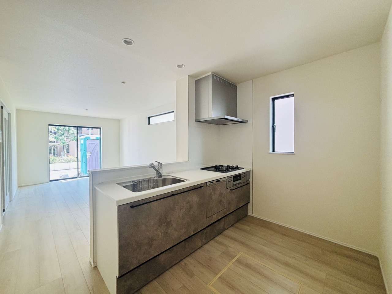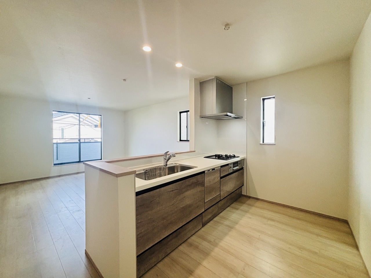 B号棟 リビングにいる家族の顔が見渡せるカウンターキッチン。お料理もより一層おいしく、楽しく。食器棚を背面に設置しても十分な広さを確保しています。 2026/04/16m