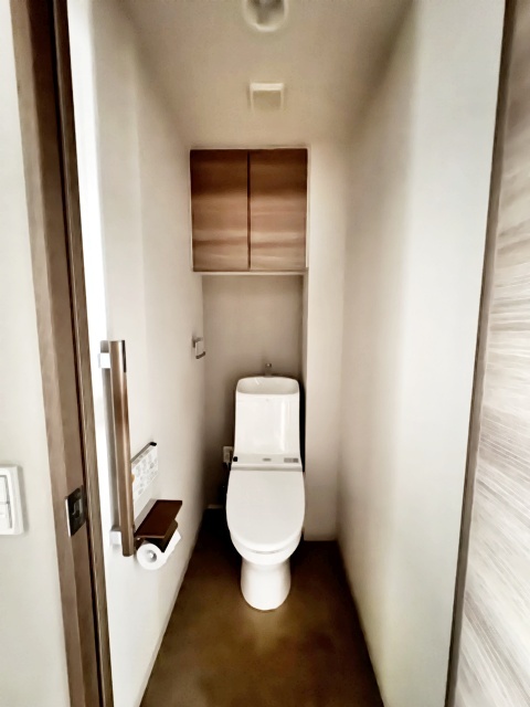 ウォシュレット機能付きのトイレ。収納もあり実用性も兼ね備えた造り。