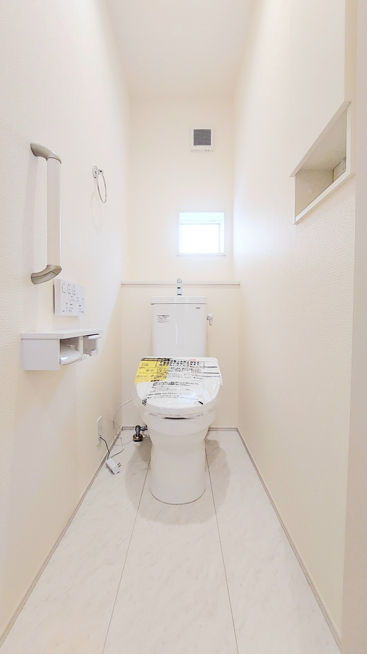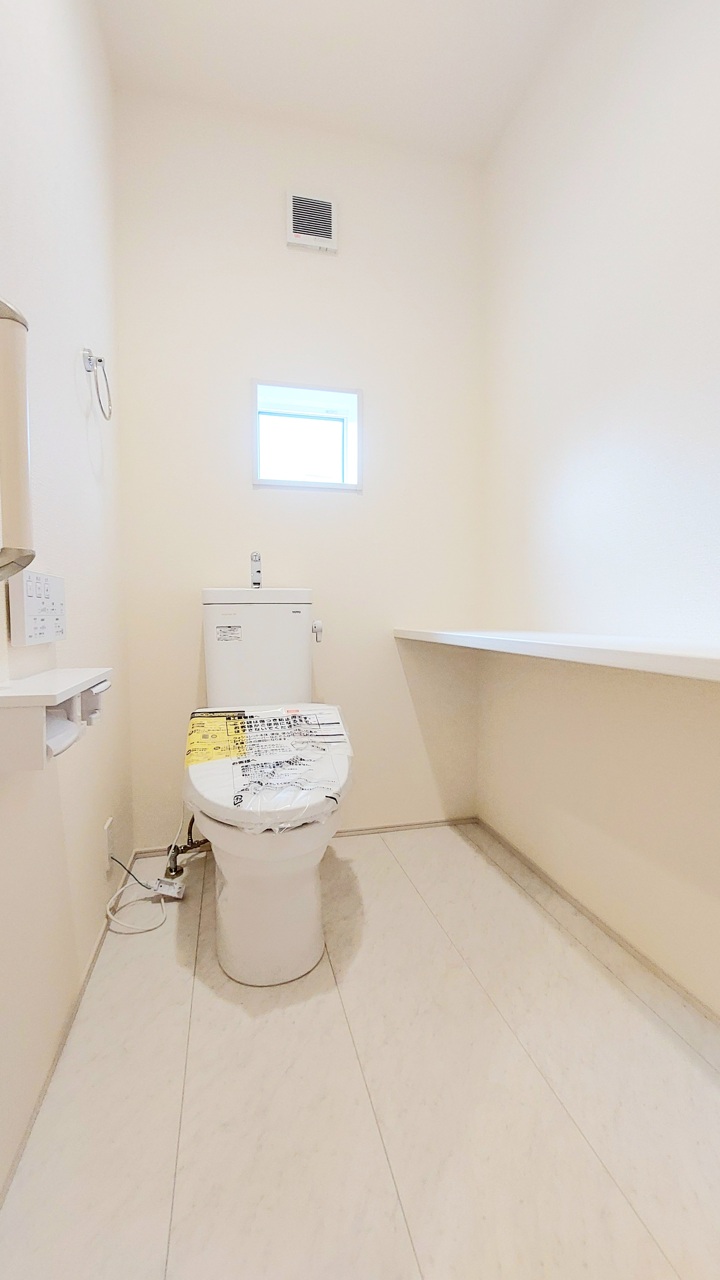 ウォシュレット機能付きのトイレ。収納もあり実用性も兼ね備えた造り。