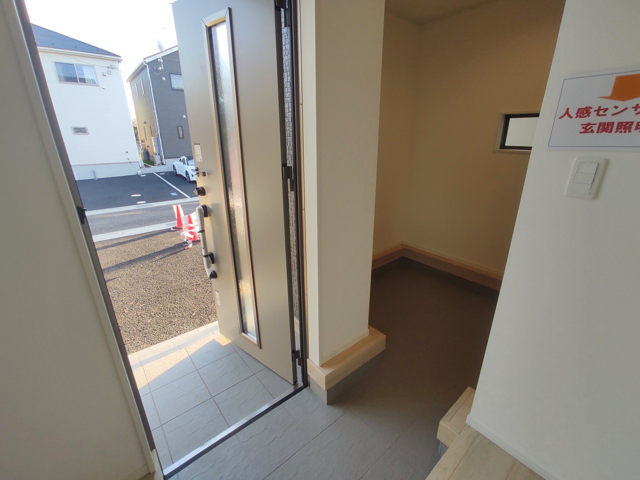 誰も住んだことのない家の玄関スペース。あたらしい木のにおいを感じていただけると思います。