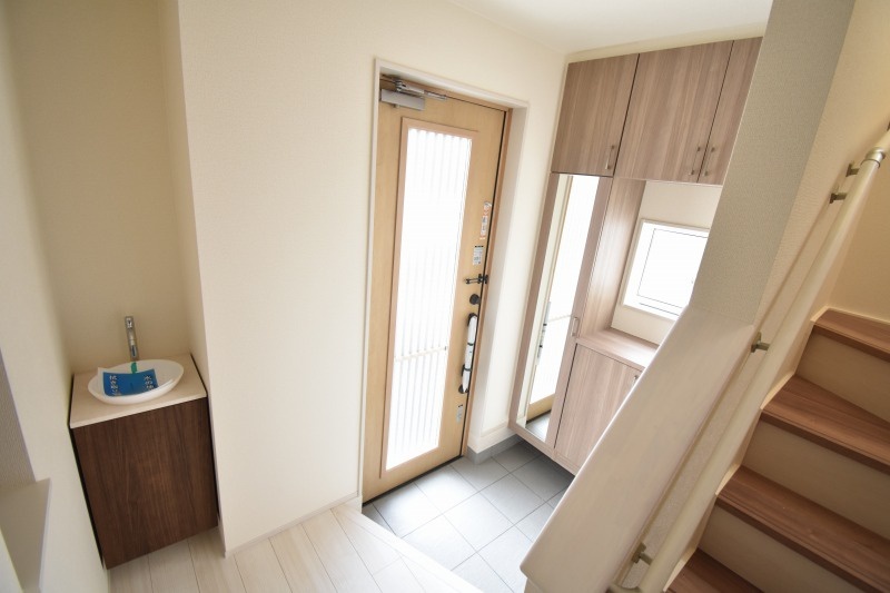 玄関は家の第一印象を左右する重要な場所。ほどよい広さとスタイリッシュな色遣いが印象的です。