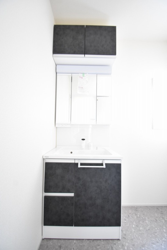 三面鏡に洗面台。 コンセントに照明機能、多機能性を備えた設備です。