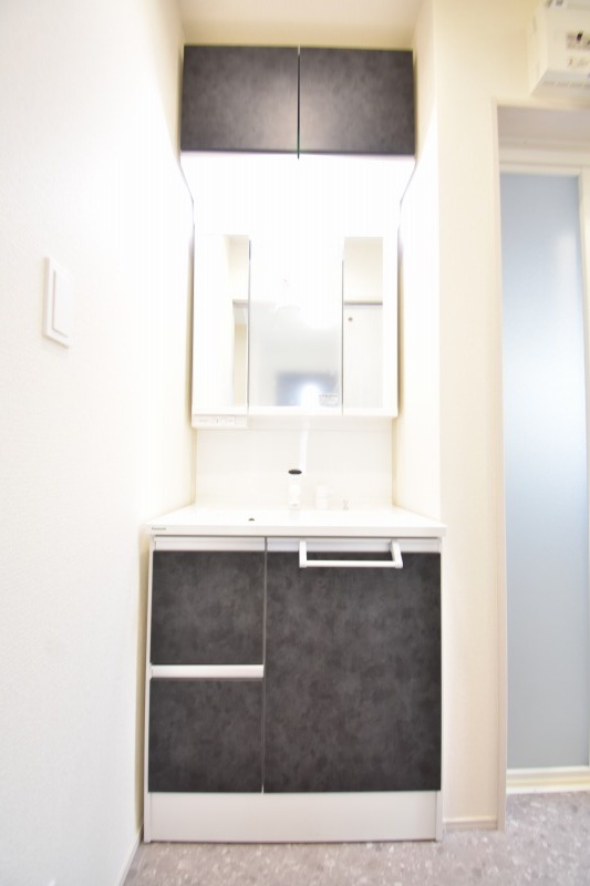 三面鏡に洗面台。 コンセントに照明機能、多機能性を備えた設備です。