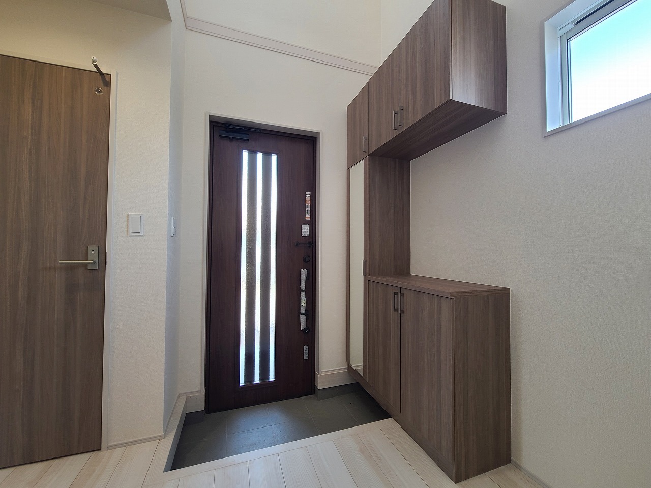 明るく開放的な玄関、靴の脱ぎ履きもしやすく、収納も豊富でご家族皆様の靴をスッキリ収納できます。