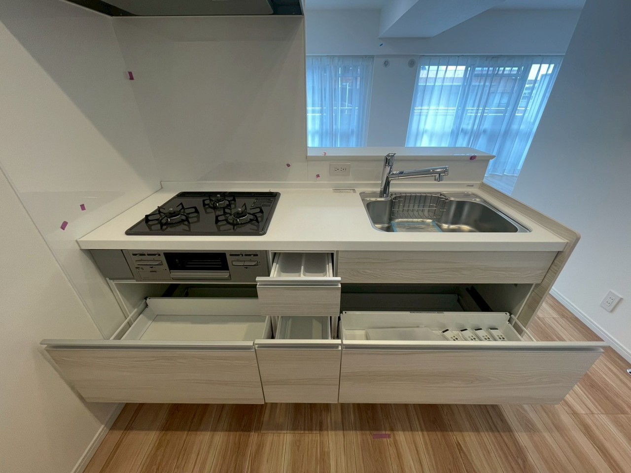 収納スライドをぐっと開けばお鍋や調味料をどんどんしまえる大収納。キッチンはいつもキレイ。