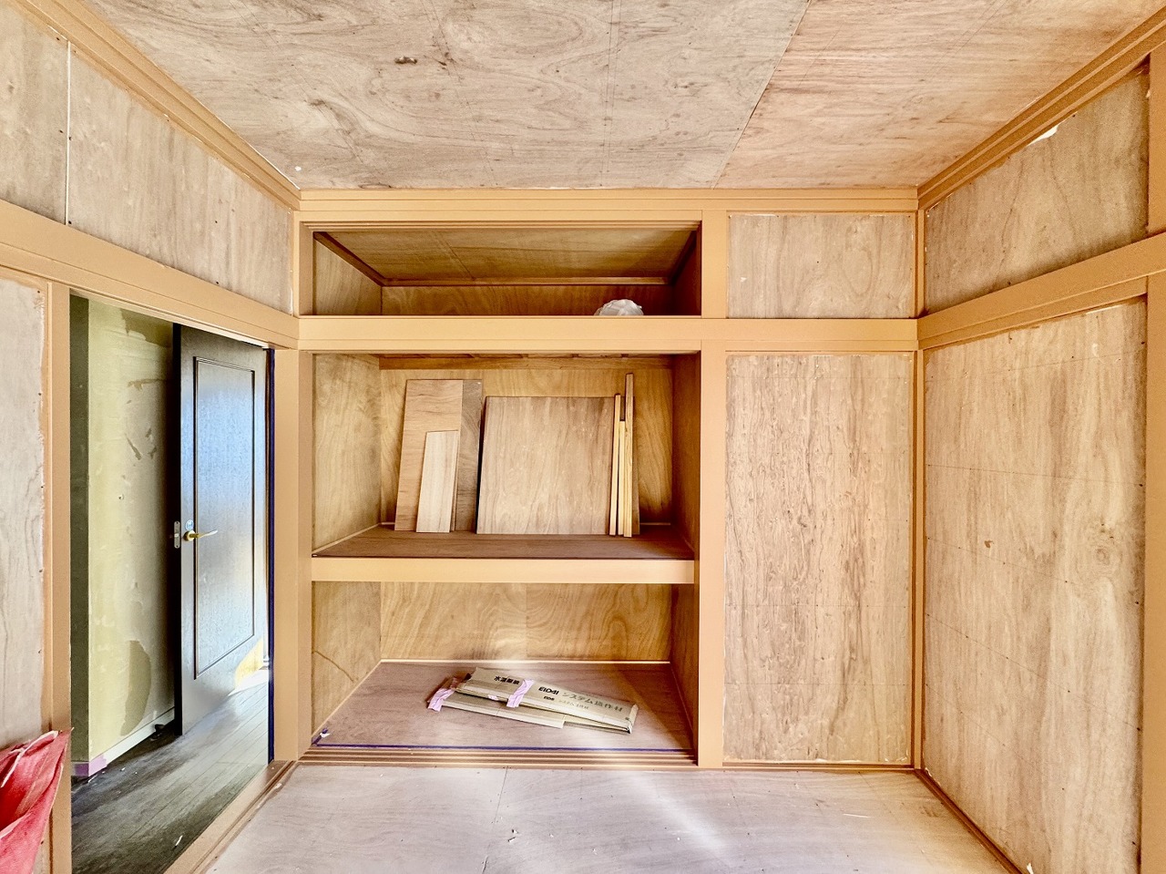 リフォーム工事中。お絵かき、工作、自由研究。お子様の思い出もたっぷり収められる大型収納。