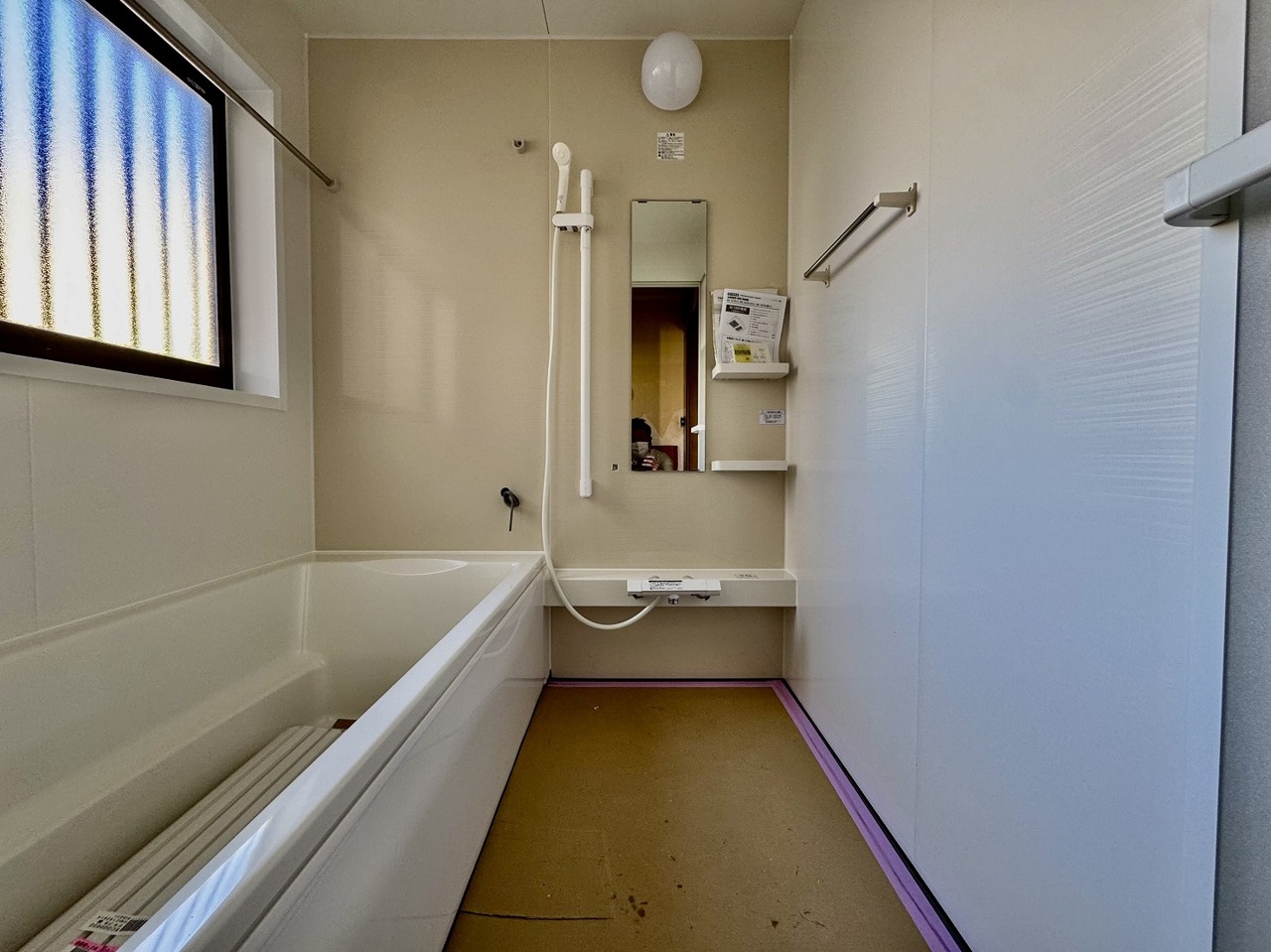 リフォーム工事中。浴室は湿気がたまりやすく、換気扇だけでは心配。。。窓をあければお風呂がカラっと乾きます。