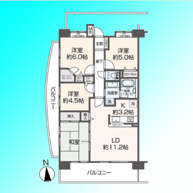 | 間取 | 4LDK (LD11.2帖、K3.2帖、和室6帖、洋室6帖、洋室5帖、洋室4.5帖) | ||