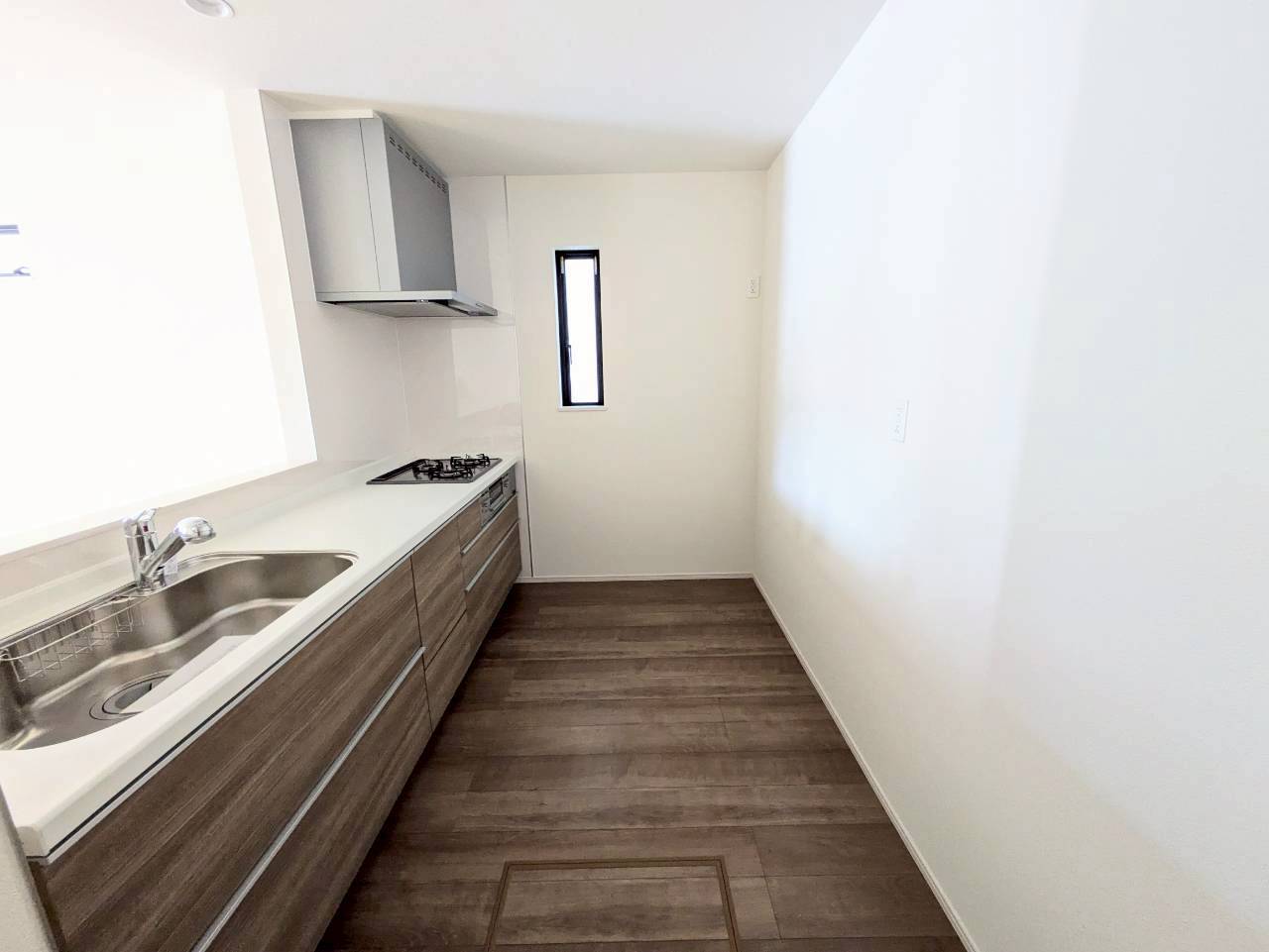 スライド収納付きシステムキッチン。お鍋類の出し入れもスムーズ。