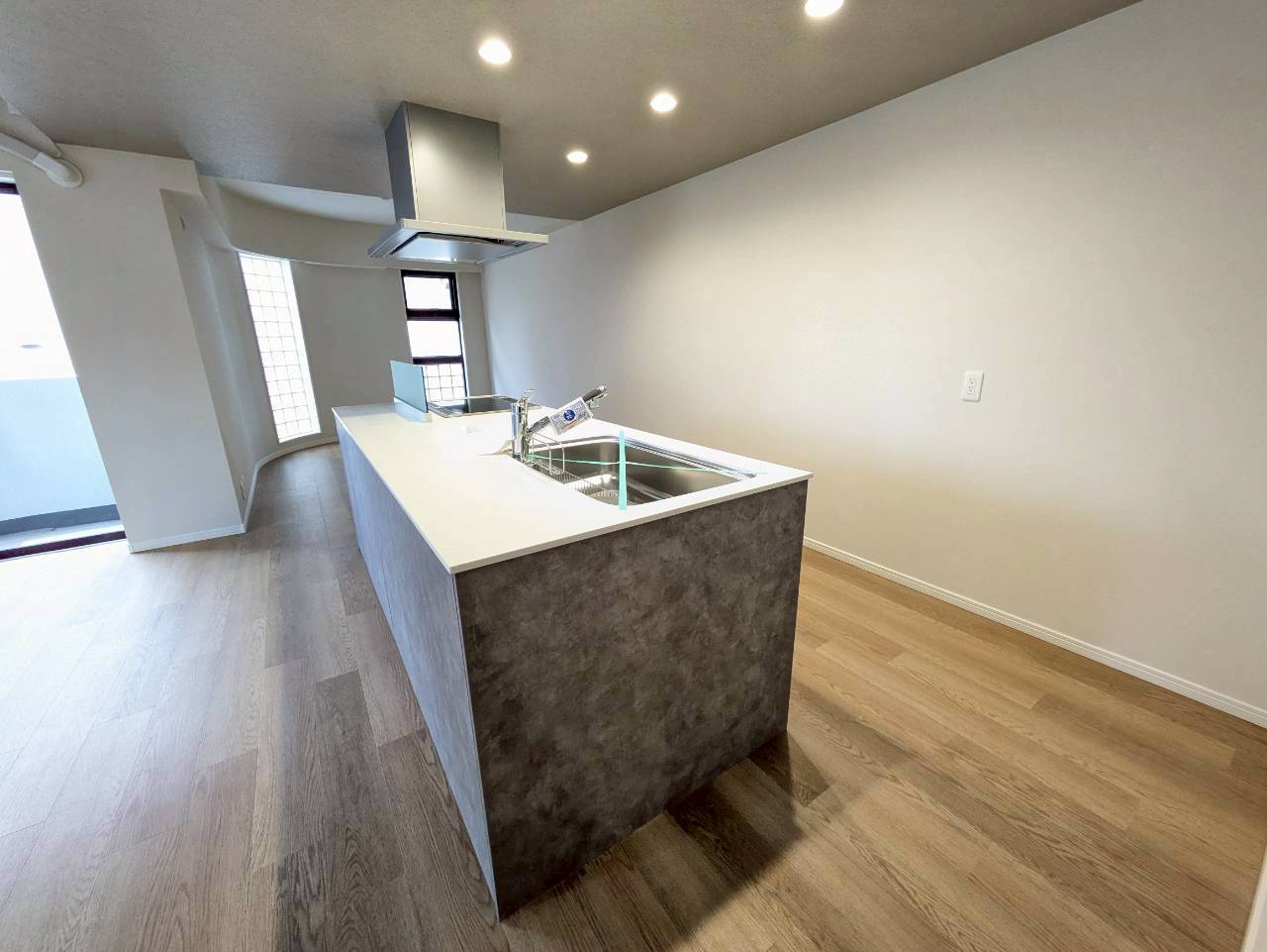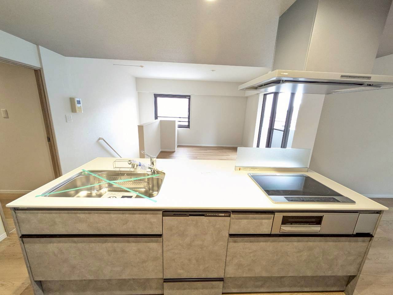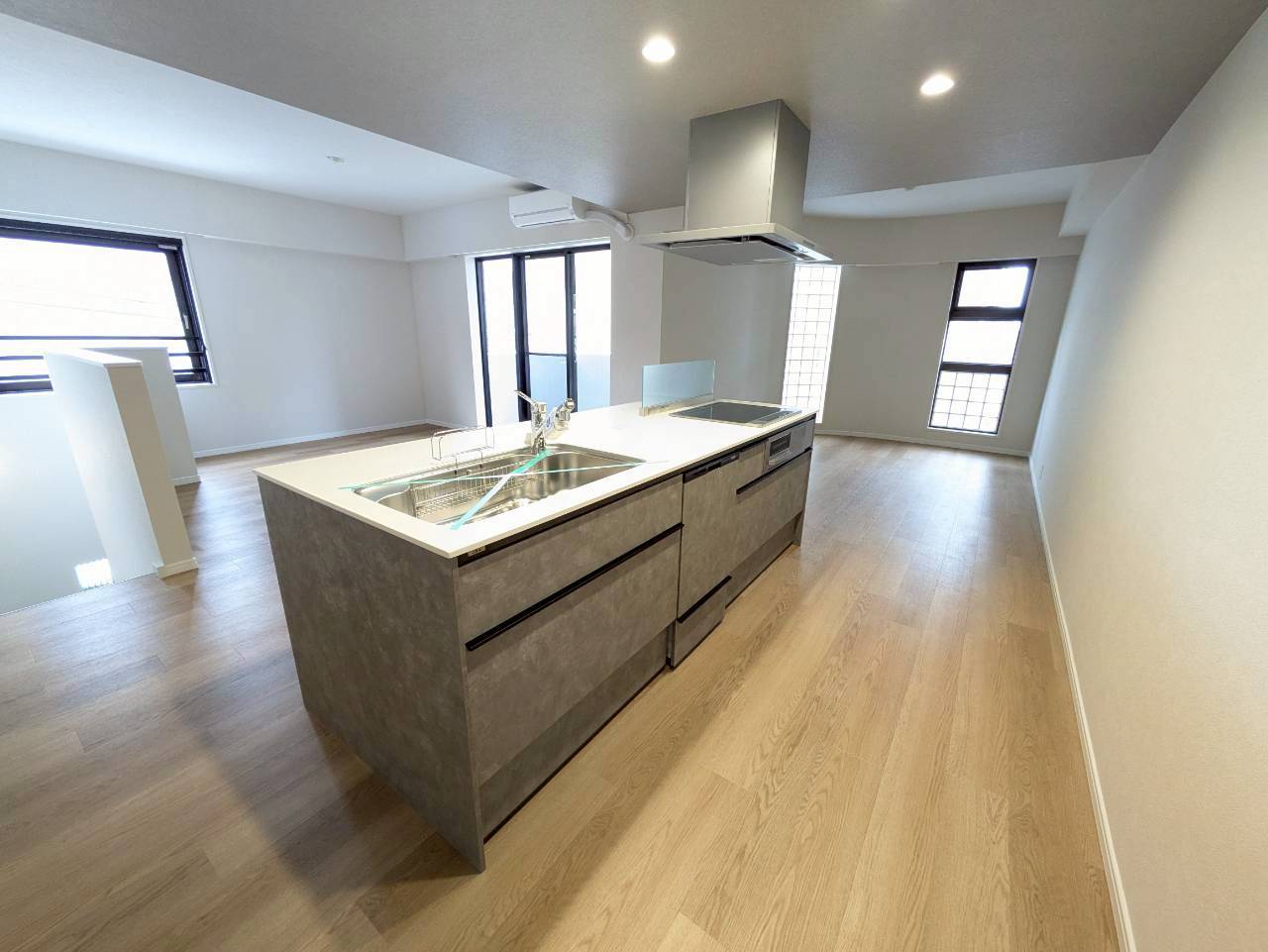 吊戸棚で視界を遮らず、パノラマ感を重視したタイプのキッチンスペース。