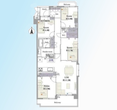 | 間取 | 4LDK (LDK15.2帖、洋室4.4帖、洋室4.8帖、洋室5.7帖、洋室5.9帖) | ||