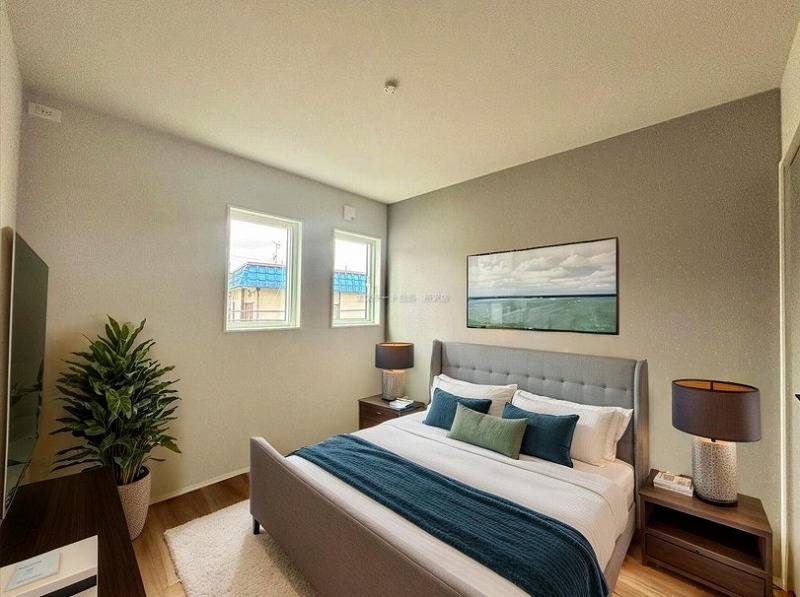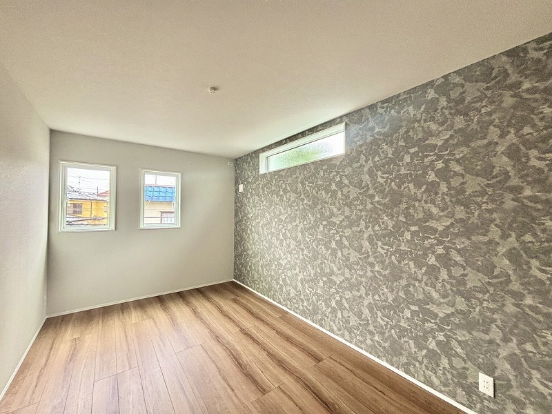 アクセントクロスを使用したオシャレな洋室。窓からそそぐ陽の光が眩しいベッドルームは、朝の目覚めが心地良く迎えられそうです。