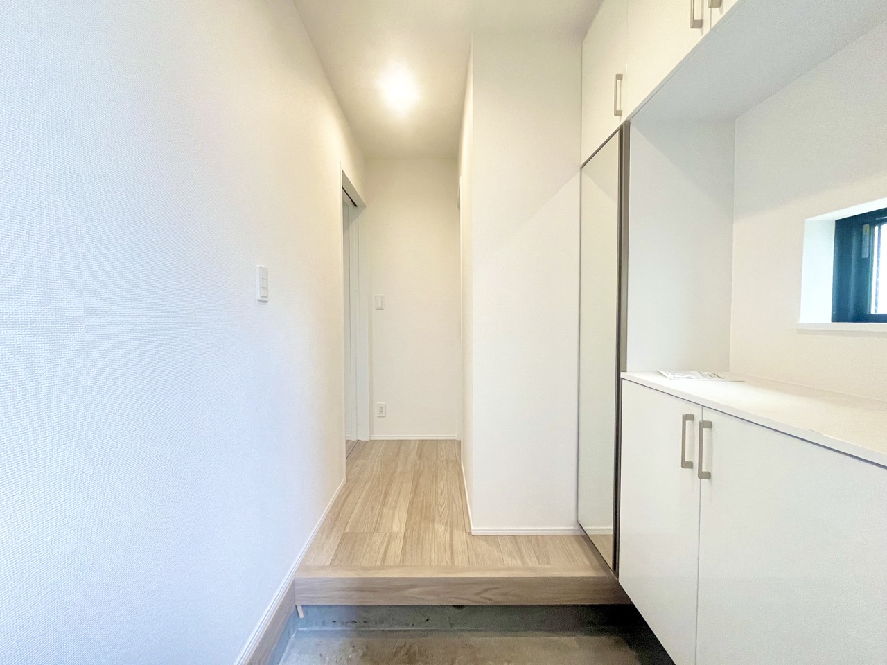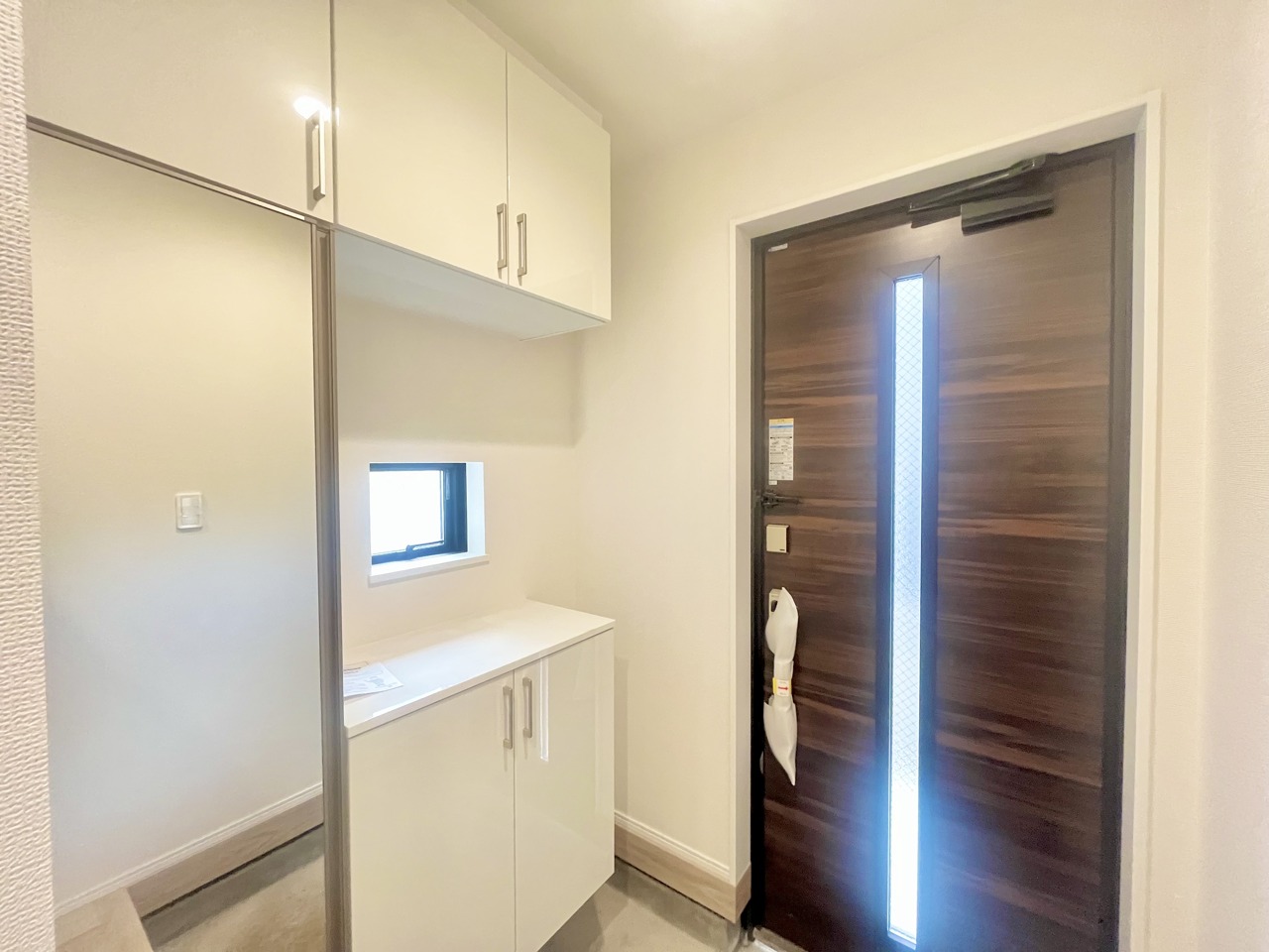 A号棟 お宅の顔となる明るく開放的な玄関。ご家族皆様様の靴を収納できるスペースと全身鏡があり、お出掛け前に身だしなみチェックもできます。