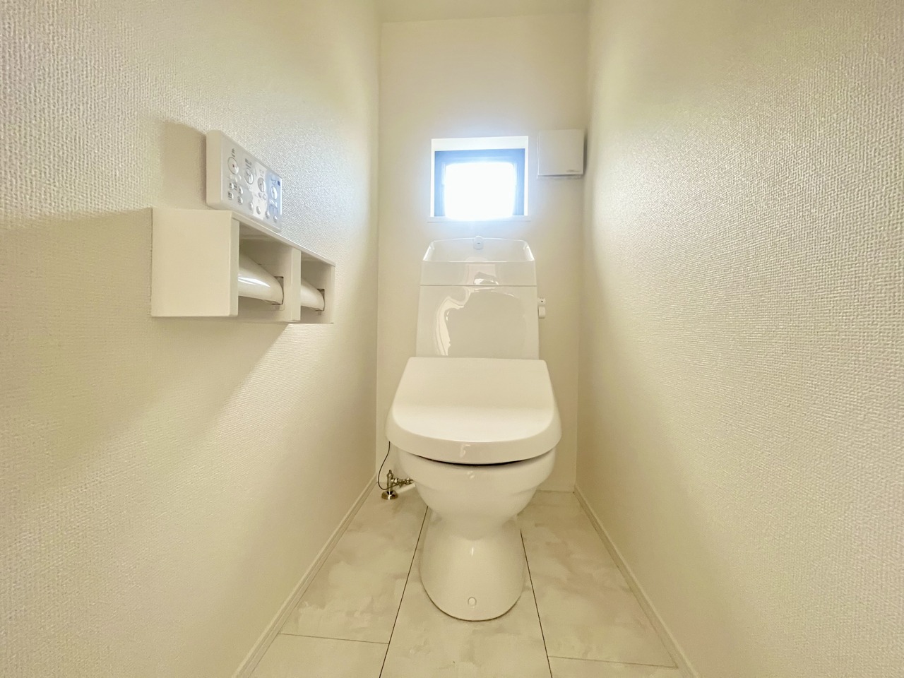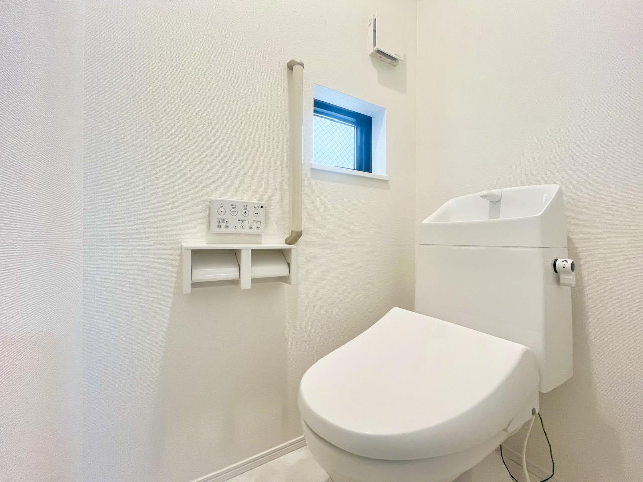 A号棟 ウォシュレット機能付きのトイレ。換気のしやすい窓付きで、収納もあり実用性も兼ね備えた造り。