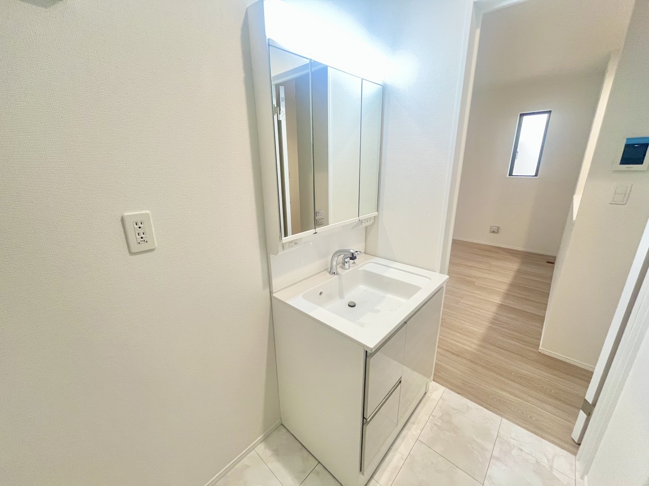 A号棟 お出かけ前の身だしなみに一歩差がつく三面鏡。ミラー裏にはたっぷり収納もございます。