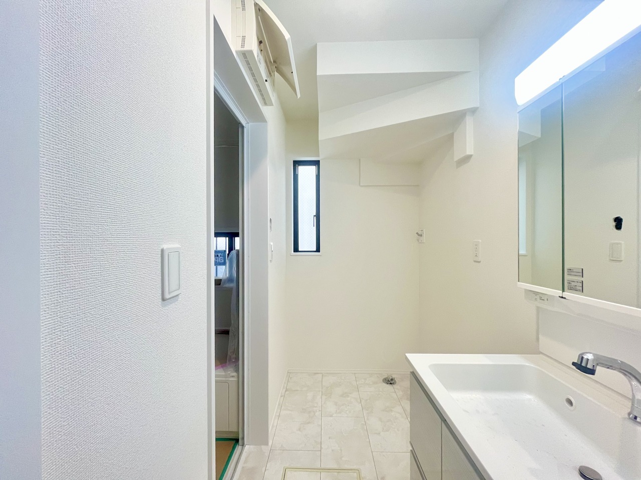 A号棟 使い勝手の良い洗面台、窓があることで換気もしやすく清潔感のある空間を保てます。