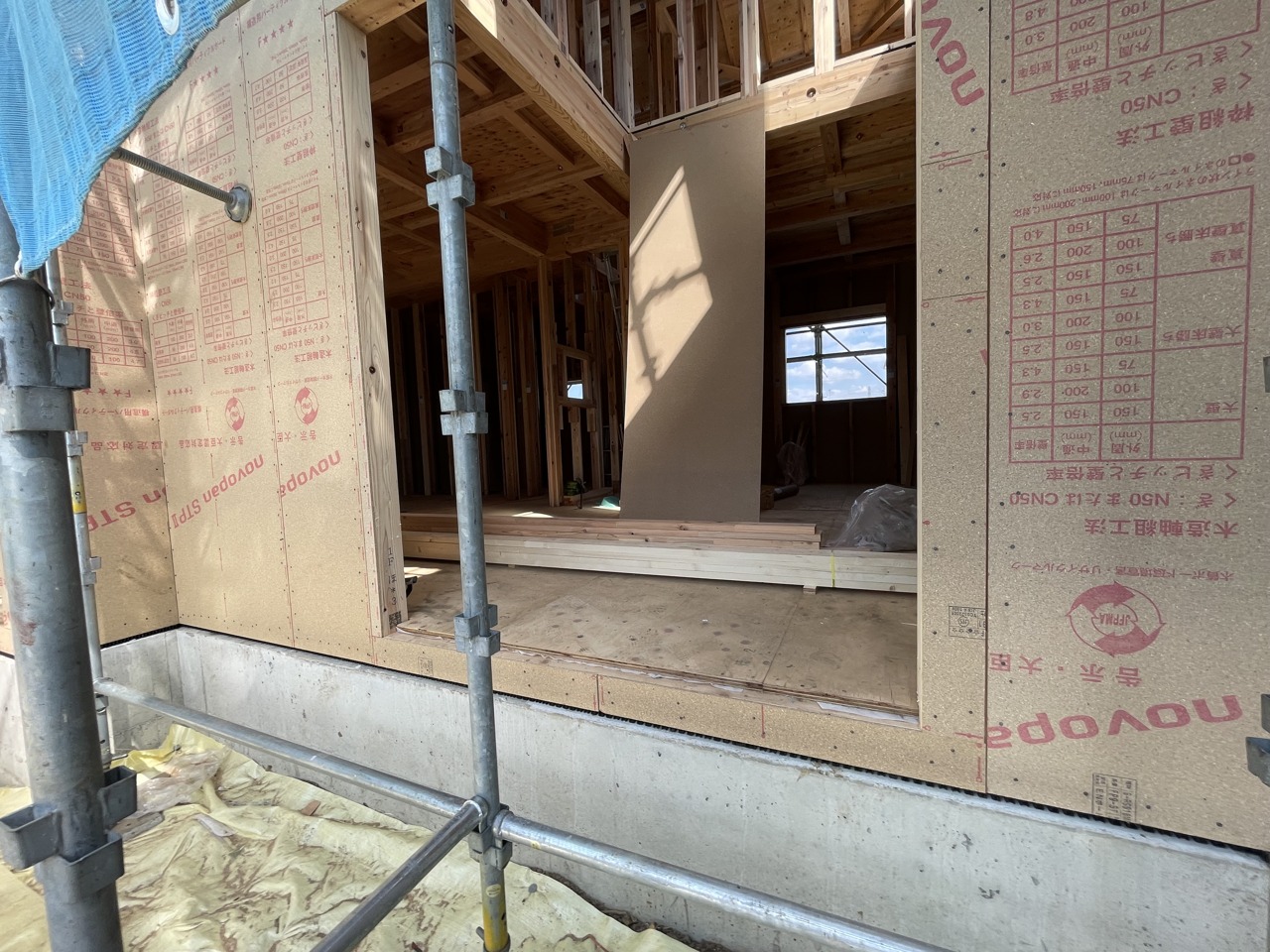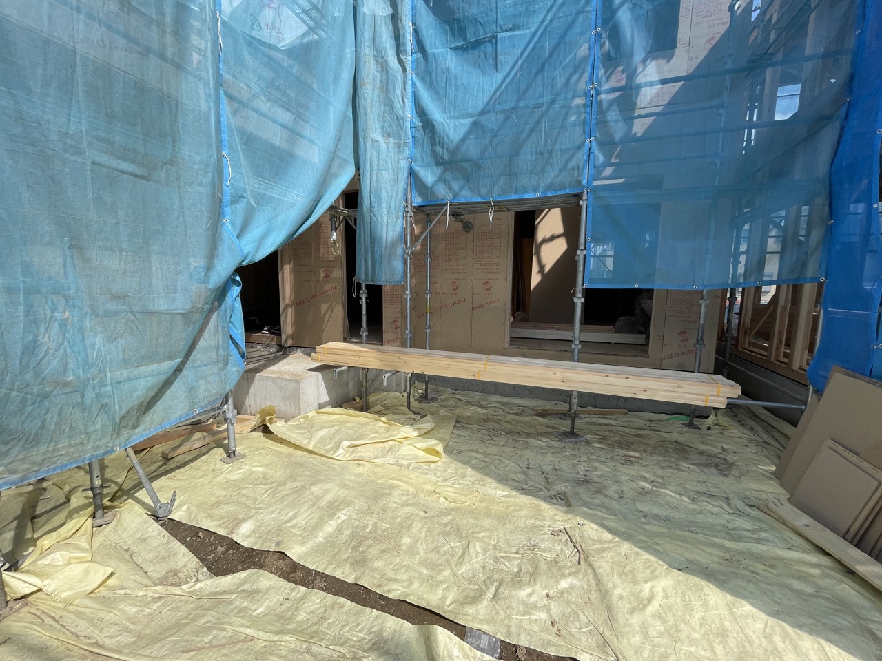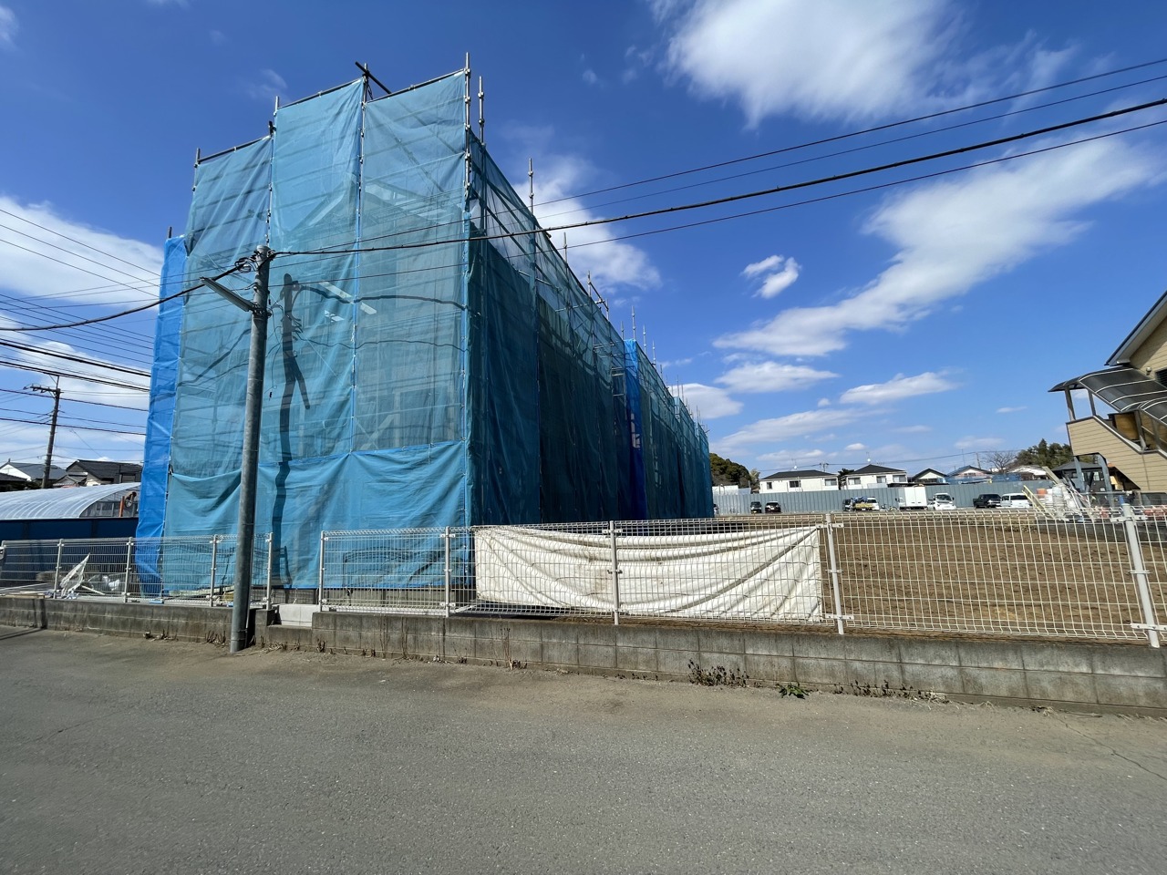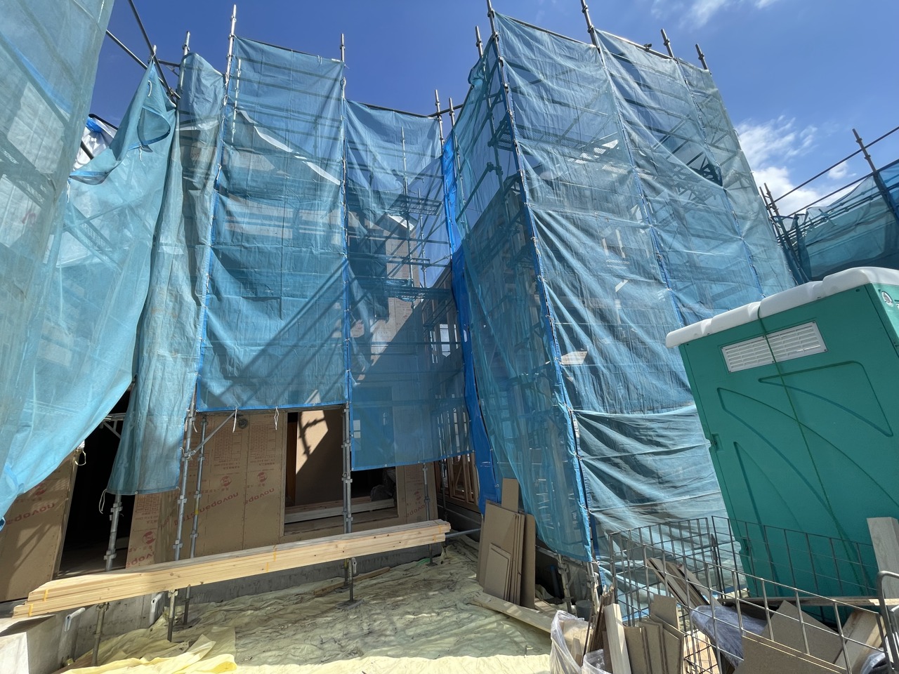 青いシートに包まれた、未来への期待が膨らむ建設現場
