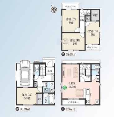 | 間取 | 4LDK (洋室5.8帖、LDK16.3帖、洋室6帖、洋室6帖、洋室5帖) | ||