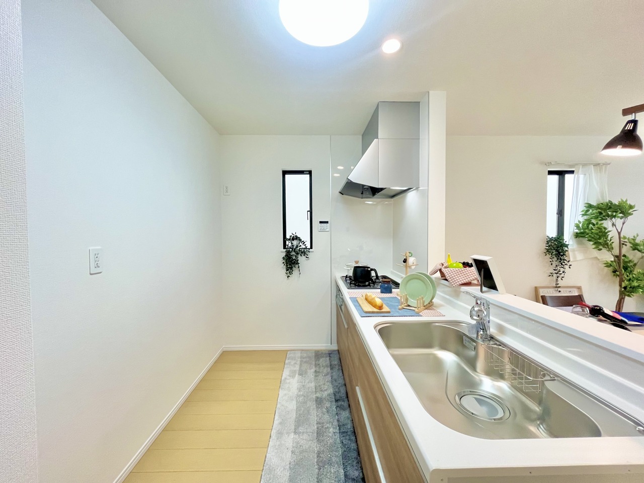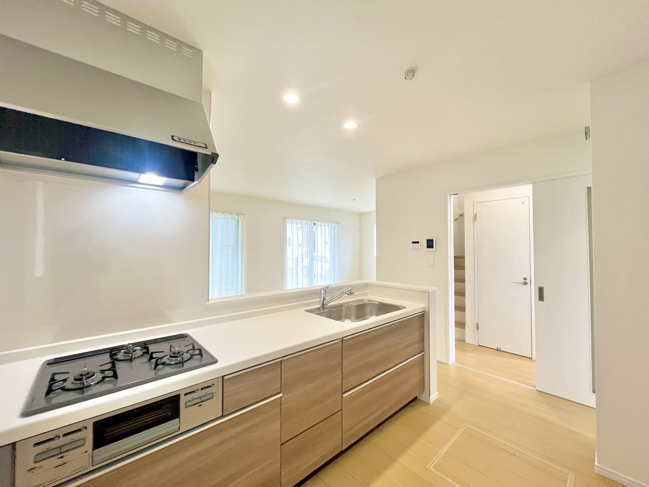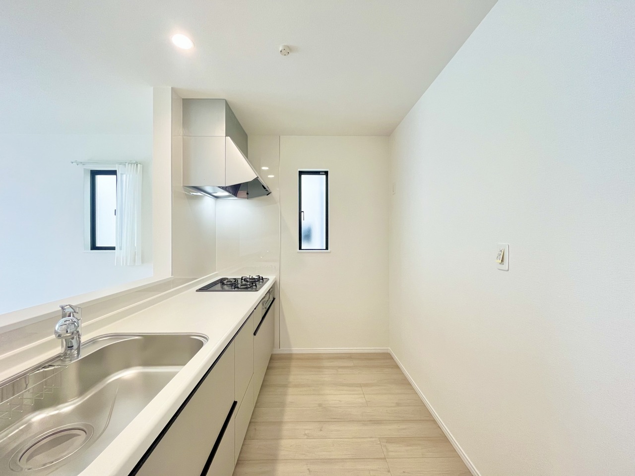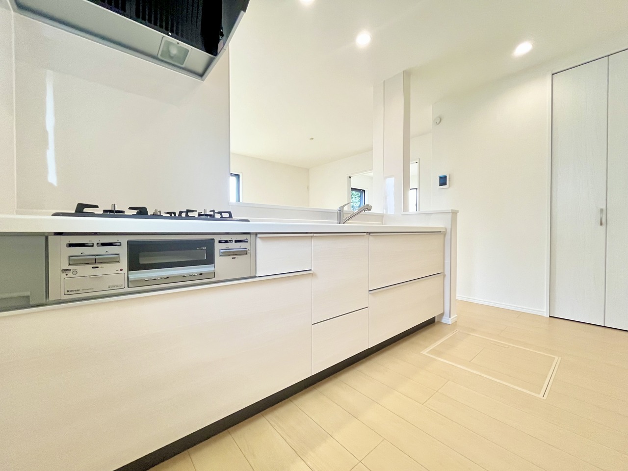 1-B号棟 リビングにいる家族の顔が見渡せるカウンターキッチン。お料理もより一層おいしく、楽しく。食器棚を背面に設置しても十分な広さを確保しています。 2026/03/22m