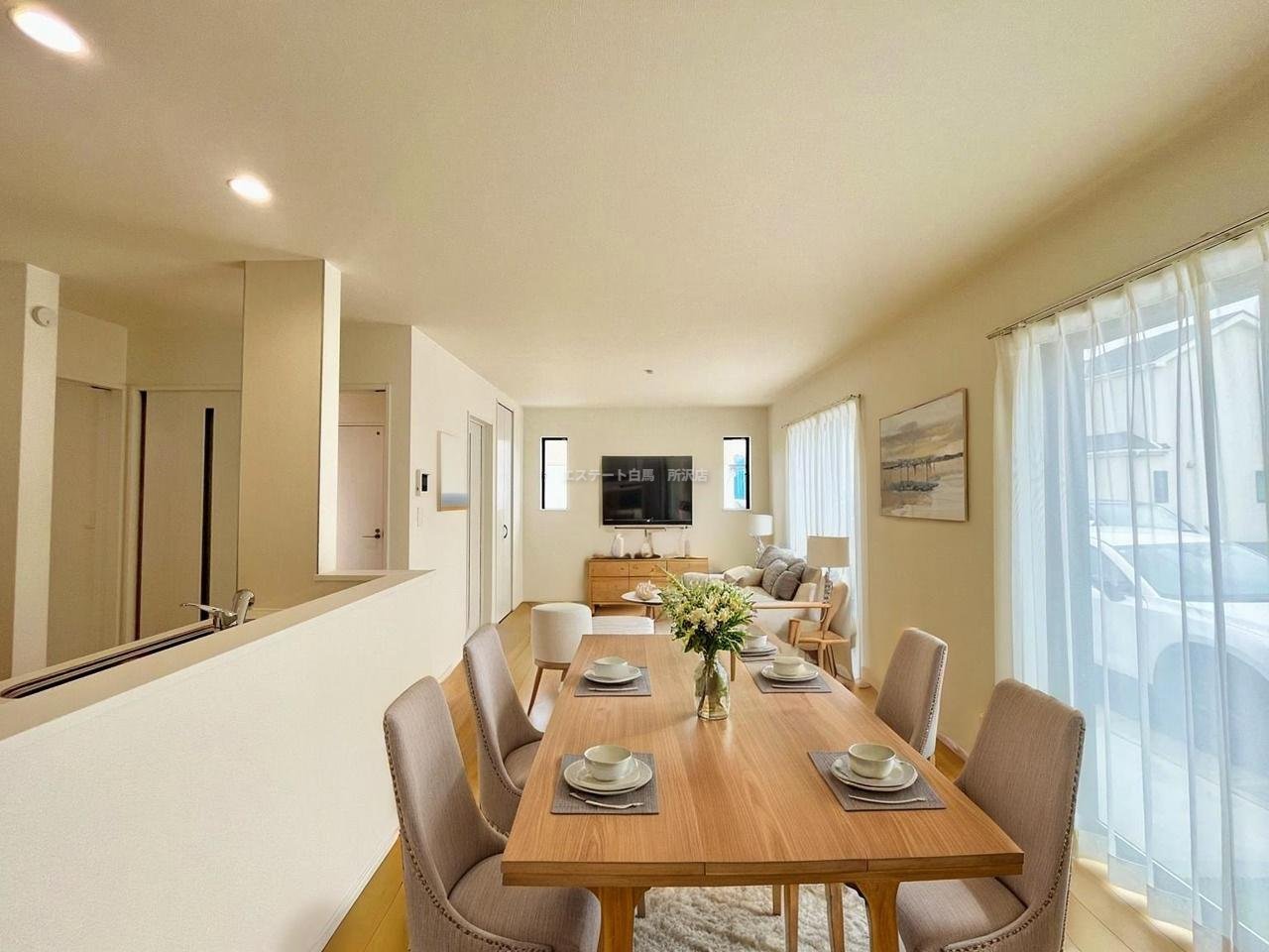 1-A号棟 家族団欒のリビング。陽光差し込む食卓には家族の会話とスマイルが溢れます。いつまでもここで食卓を囲みたくなる、そう感じさせてくれるスペース。 2026/03/22m