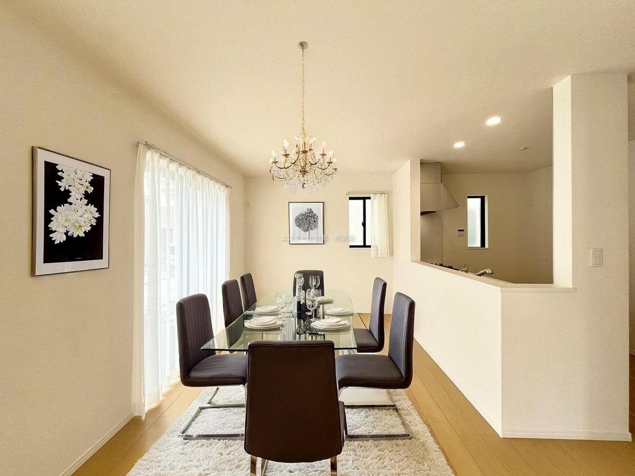 1-K号棟 家族団欒のリビング。陽光差し込む食卓には家族の会話とスマイルが溢れます。いつまでもここで食卓を囲みたくなる、そう感じさせてくれるスペース。 2026/03/22m