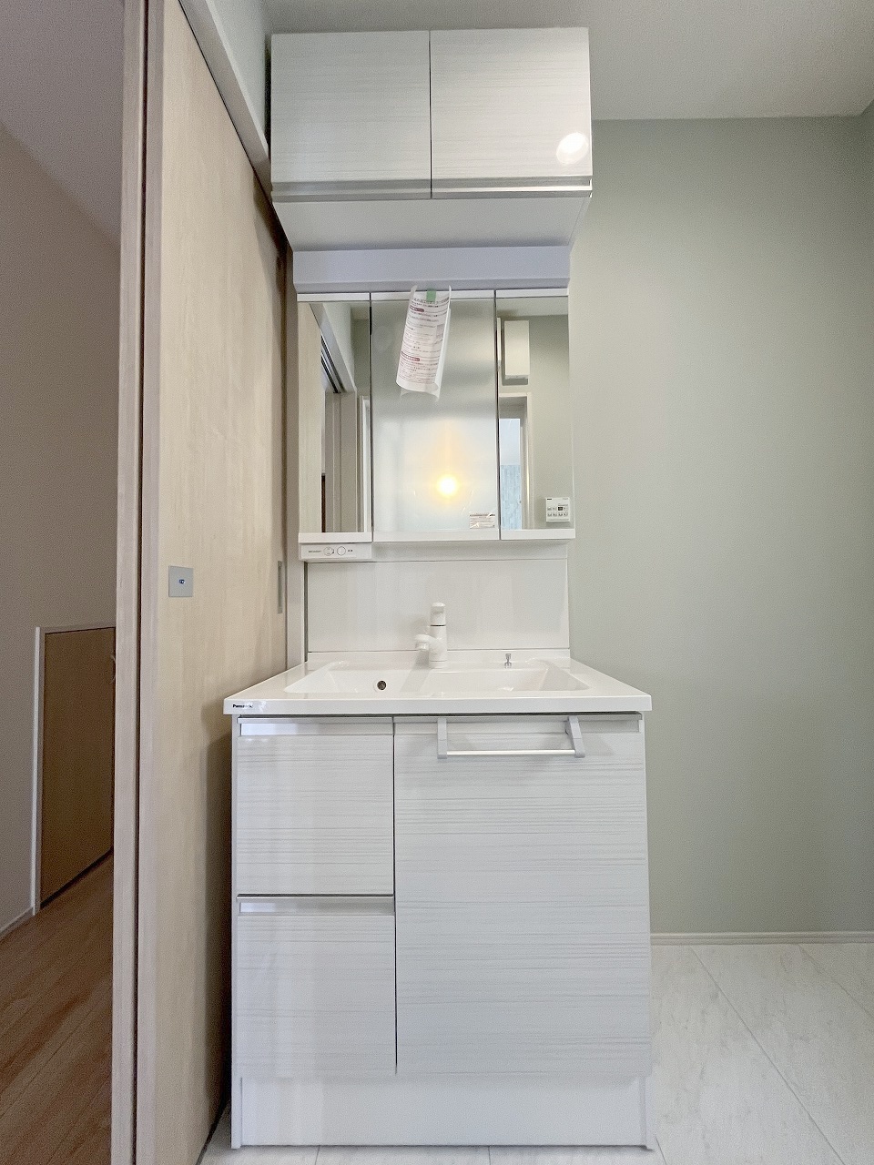 1号棟 三面鏡に洗面台。 コンセントに照明機能、多機能性を備えた設備です。