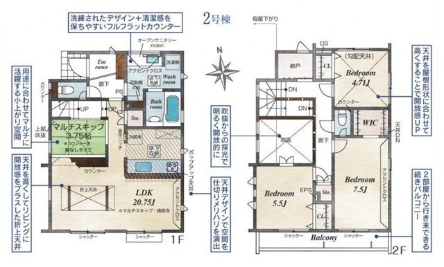 北西角地。上部吹き抜け、畳敷きのマルチスキップ。リビング階段。納戸、WIC。浴室換気乾燥機。駐車並列2台可(車種による)。