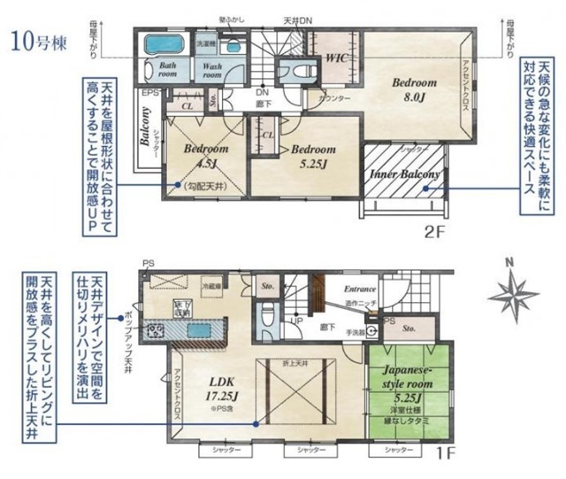LDK17.2帖。リビング続きの和室。2階洗面浴室。WIC、2階廊下収納。インナーバルコニー。浴室換気乾燥機。駐車並列2台可(車種による)。