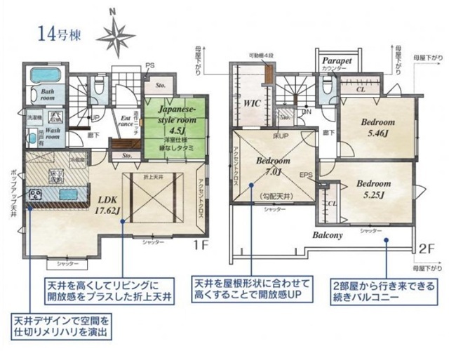北東角地、南側隣地通路。LDK17.62帖。リビング続きの和室。WIC、廊下・リビング収納。浴室換気乾燥機。駐車並列2台可(車種による)。
