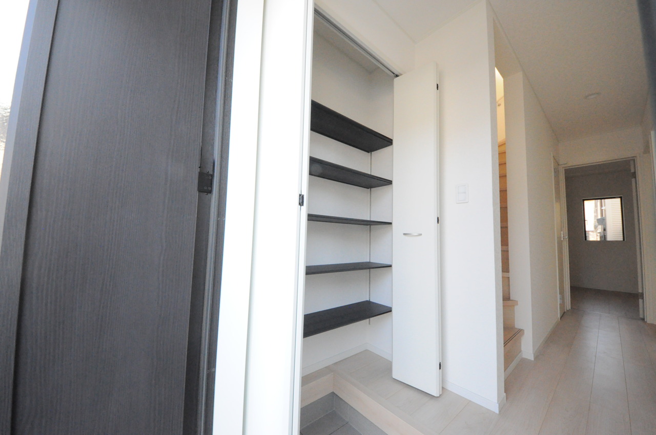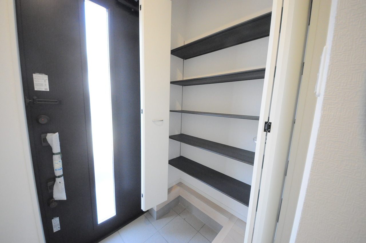 明るく開放的な玄関、靴の脱ぎ履きもしやすく、収納も豊富でご家族皆様の靴をスッキリ収納できます。