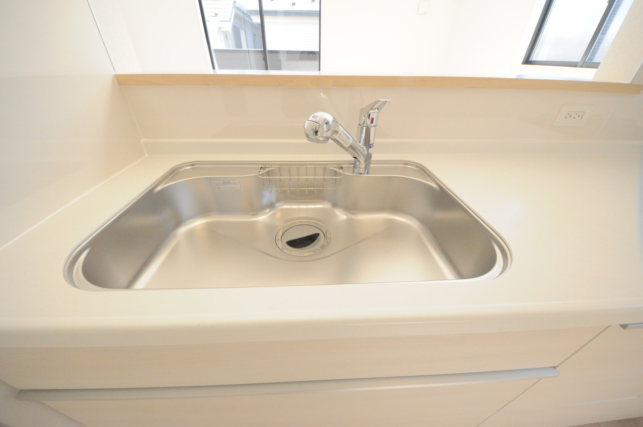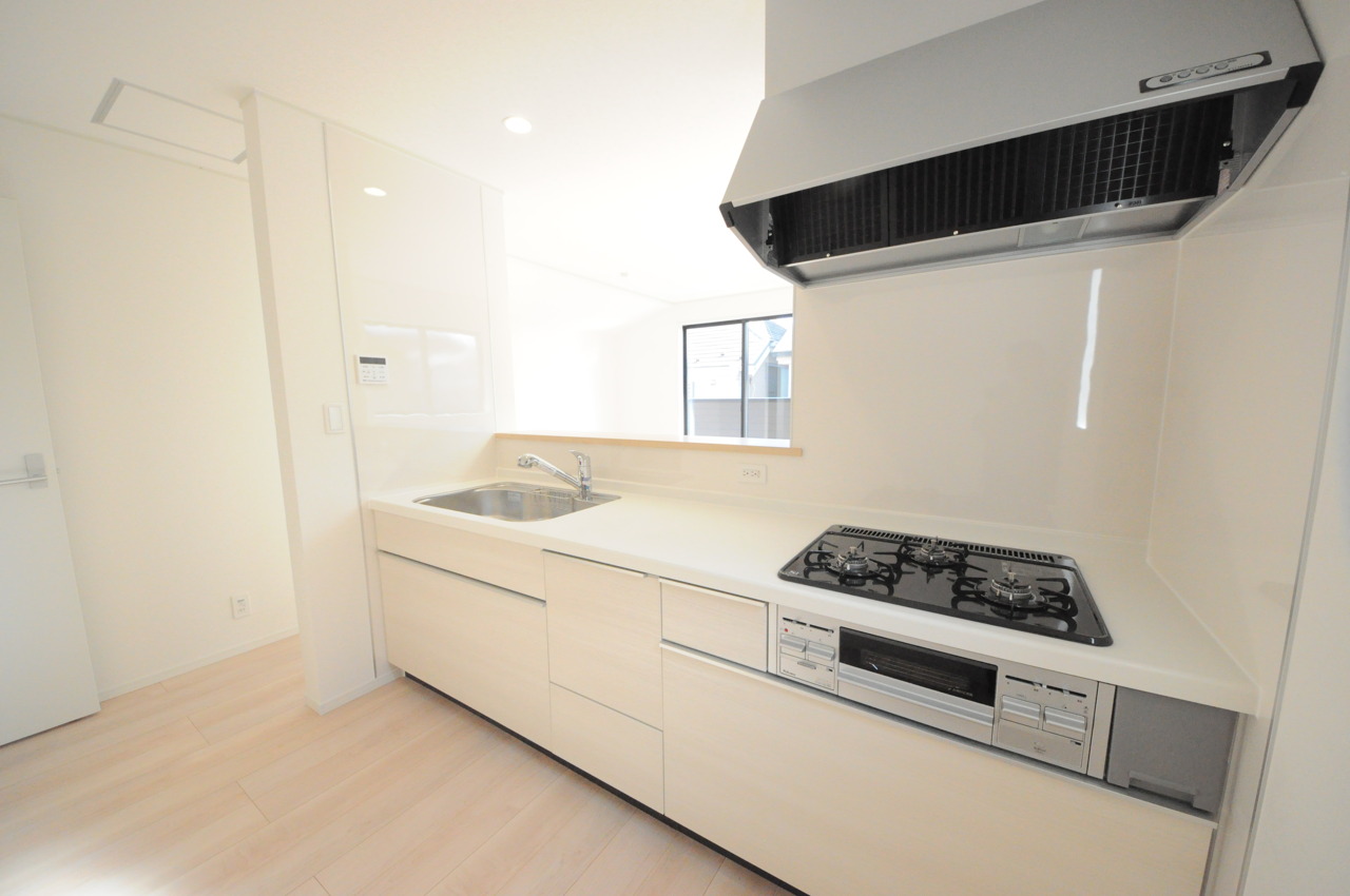 人工大理石を使用したシステムキッチン。永く傷つきにくく、お手入れもしやすい高機能性です。