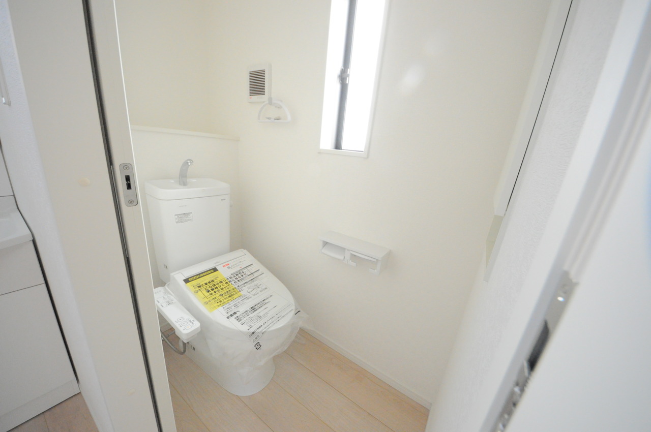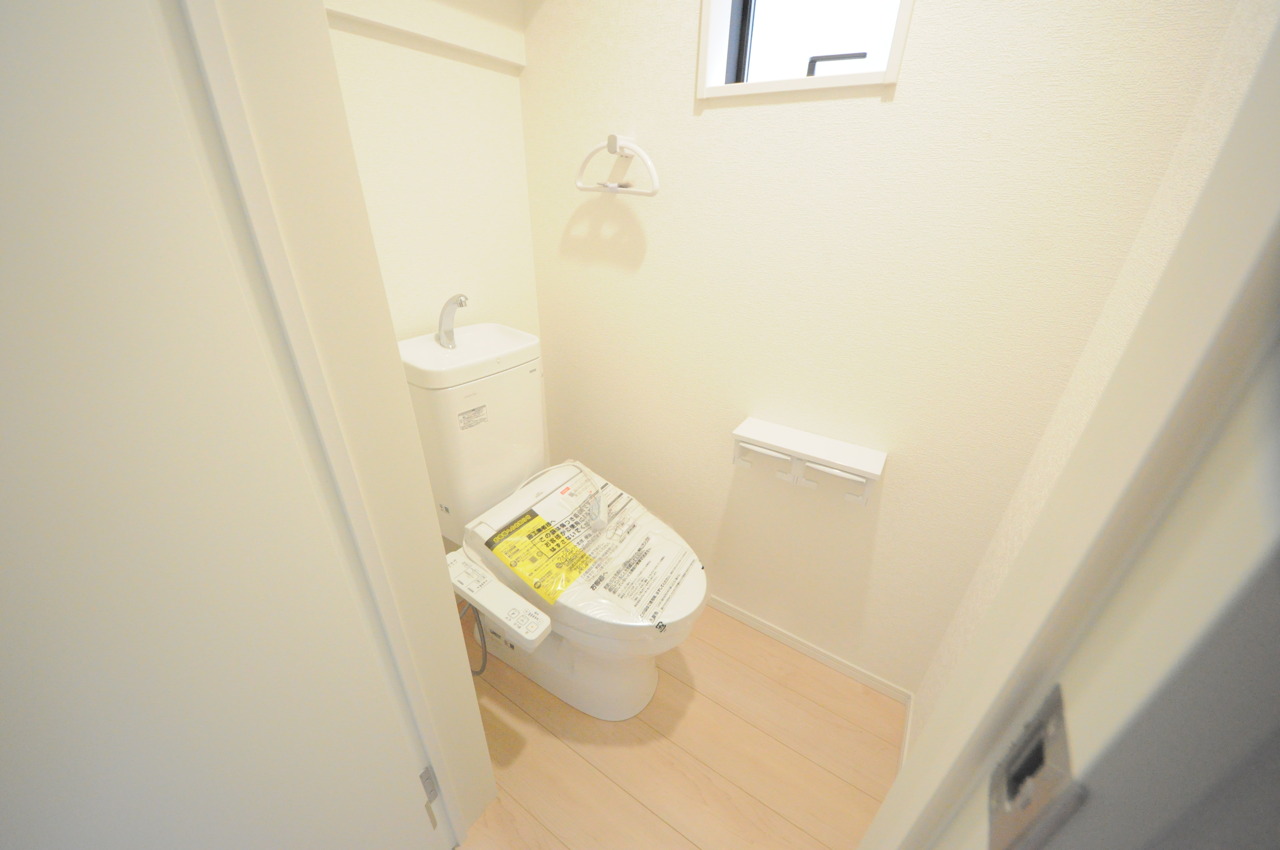 ウォシュレット機能付きのトイレ。換気のしやすい窓付きで、収納もあり実用性も兼ね備えた造り。