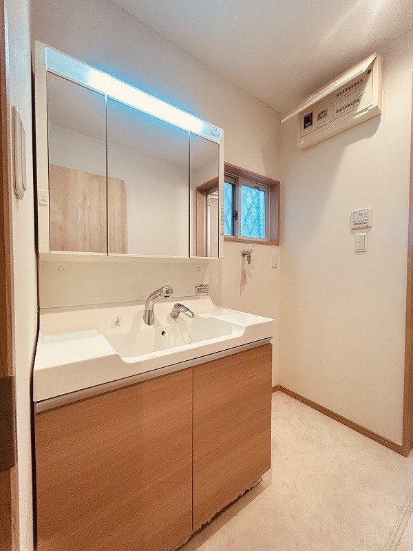 三面鏡に洗面台。 コンセントに照明機能、多機能性を備えた設備です。