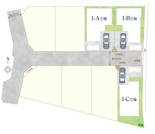 | 土地面積 | 105.37m² 公簿 (私道133.57m²別に有、私道持分比率:1/8、共有部分有) | ||