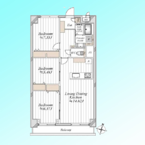 | 間取 | 3LDK (LDK14.82帖、洋室7.35帖、洋室6.37帖、洋室5.48帖) | ||
