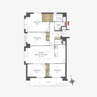 | 間取 | 4LDK (LDK17.7帖、洋室6帖、洋室5.4帖、洋室6.8帖、洋室8.6帖) | ||