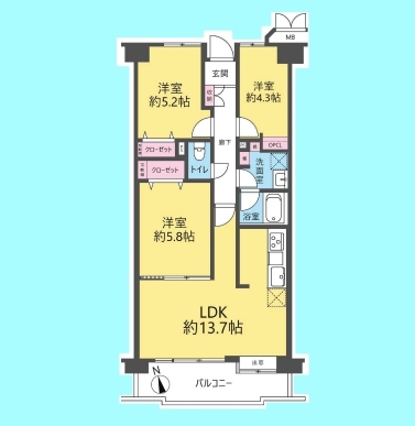 | 間取 | 3LDK (LDK13.7帖、洋室5.8帖、洋室5.2帖、洋室4.3帖) | ||