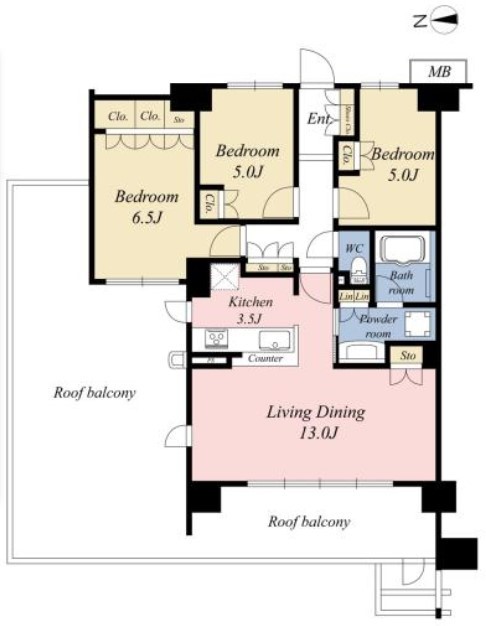 静粛性の高い上階住戸もない方向角住戸。 大きなルーフバルコニーはお部屋の約3分の2のサイズ感。 開放感、眺望は是非現地にて。
