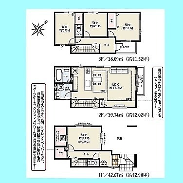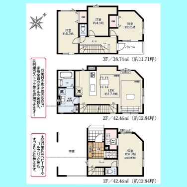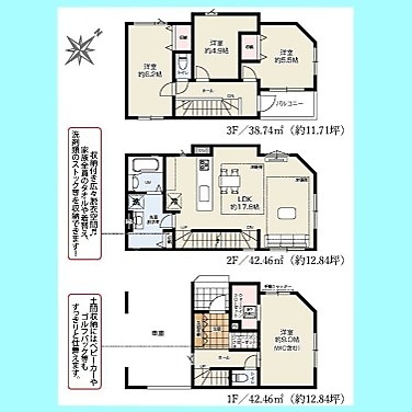 | 建物面積 | 120.5m² ~ 123.66m² 実測 (車庫面積14.49平米含む) | ||