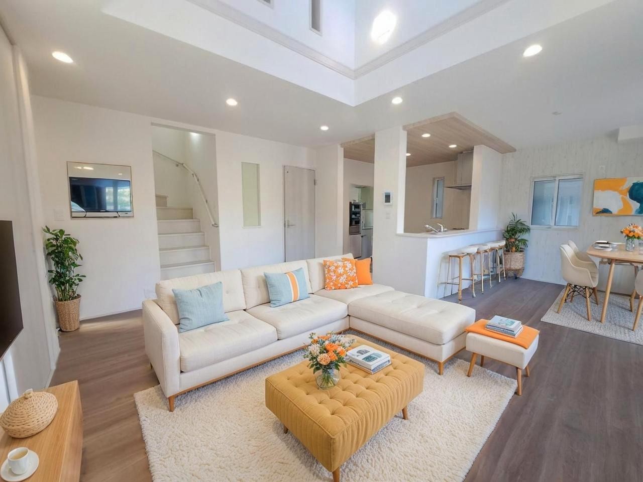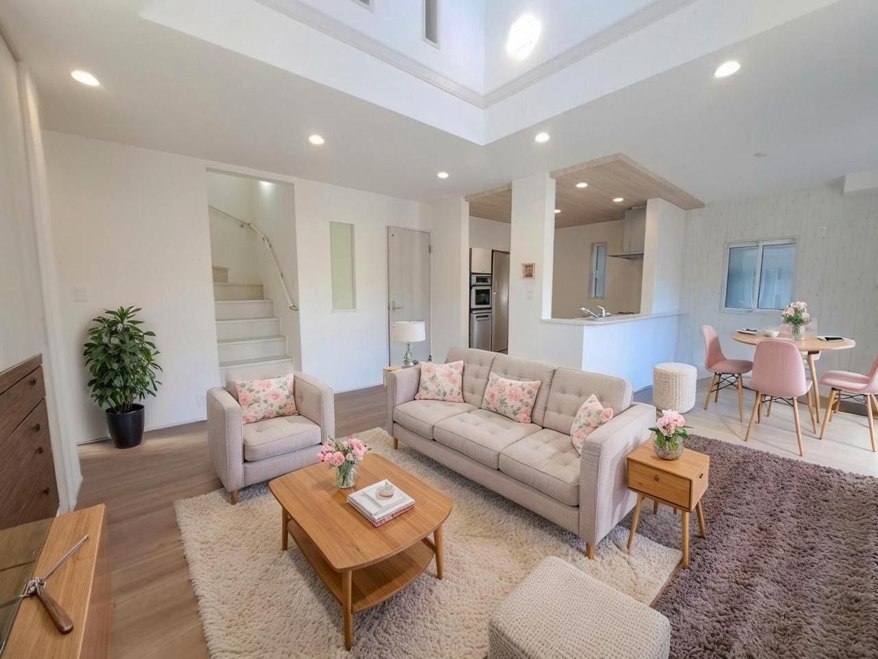 吹抜けの空間を意識した開放感のあるリビングダイニング。