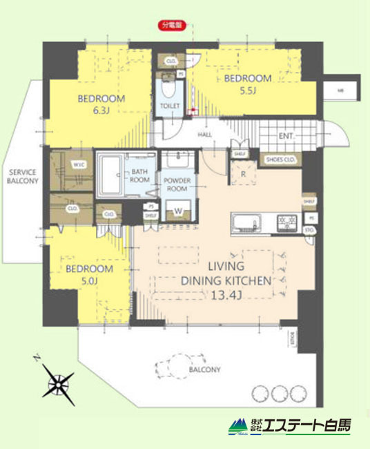 | 間取 | 3LDK (LDK13.4帖、洋室6.3帖、洋室5.5帖、洋室5帖) | ||