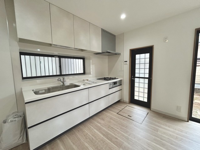 収納量豊富なシステムキッチン。明るい光が差し込む窓も調味料置き場などに役立ちます。カウンターキッチンと違い、背面を広く使えるので自由度が高いのも嬉しいですね。