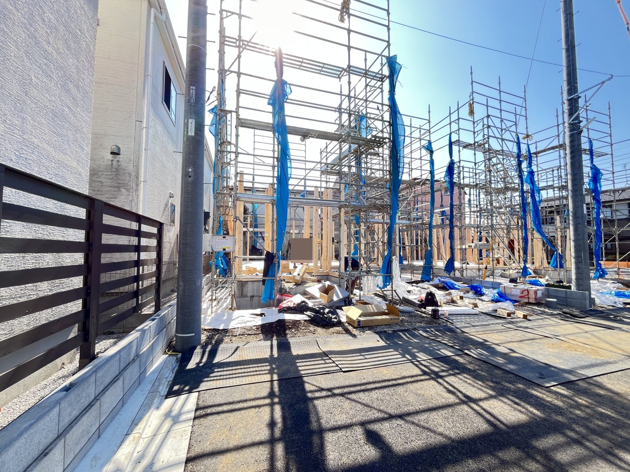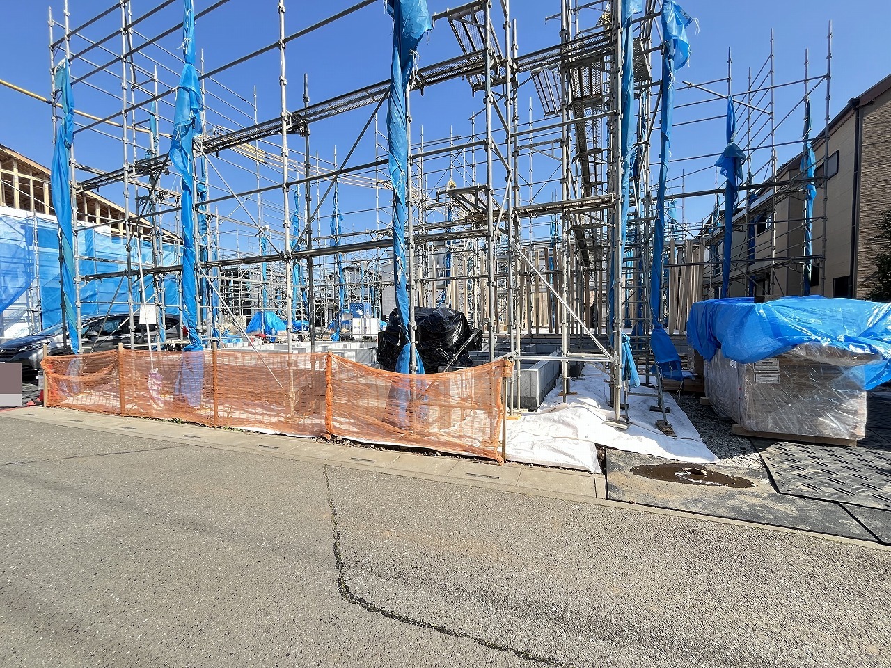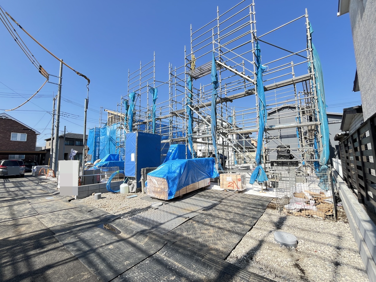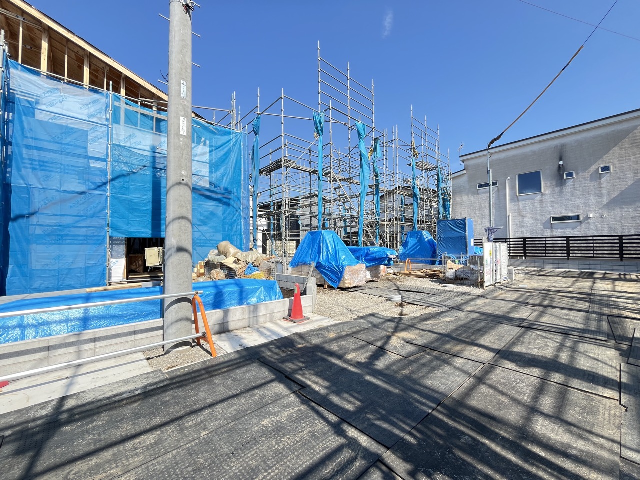 5号棟 青いシートに包まれた躯体が、これから暮らしを育む物語の始まりを静かに告げています。安全に配慮された敷地には、確かな技術と未来への想いが息づいています 2026/04/03m