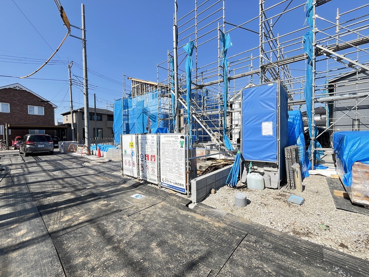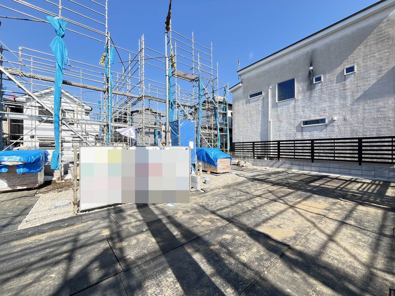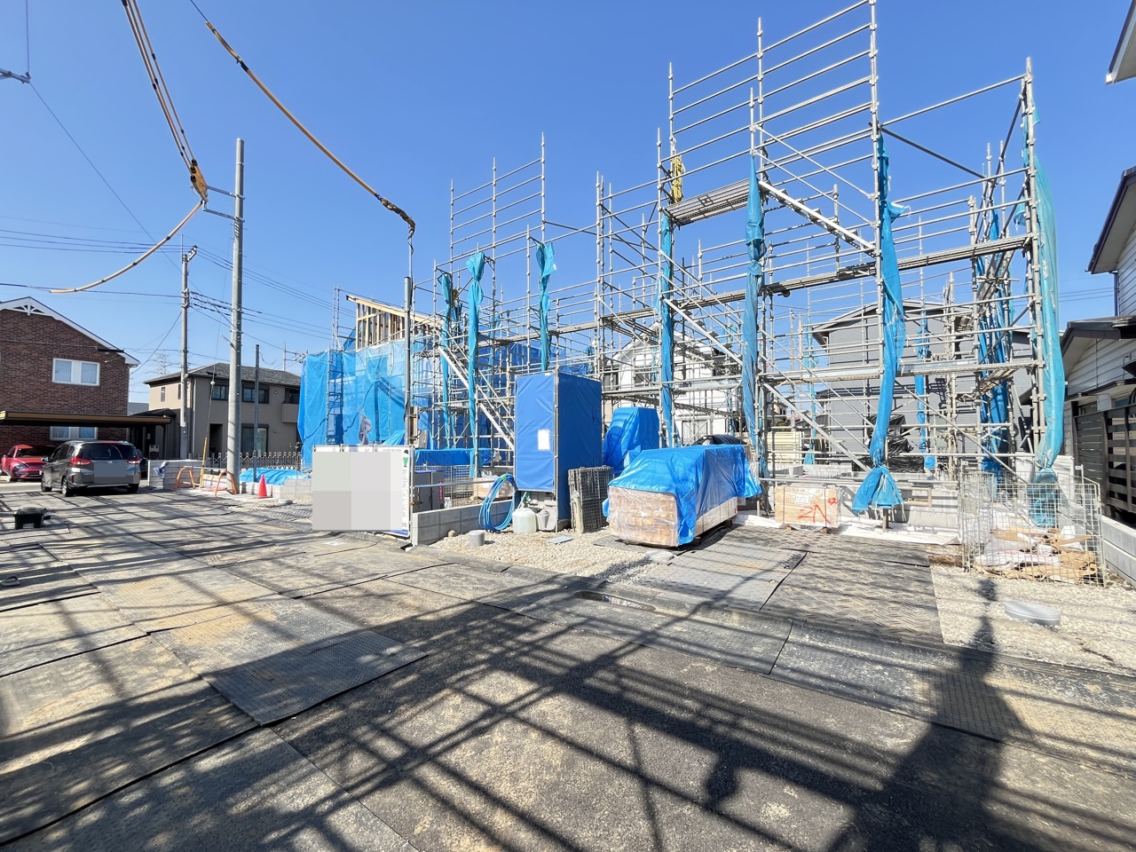5号棟 青いシートに包まれた躯体が、これから暮らしを育む物語の始まりを静かに告げています。安全に配慮された敷地には、確かな技術と未来への想いが息づいています 2026/04/03m