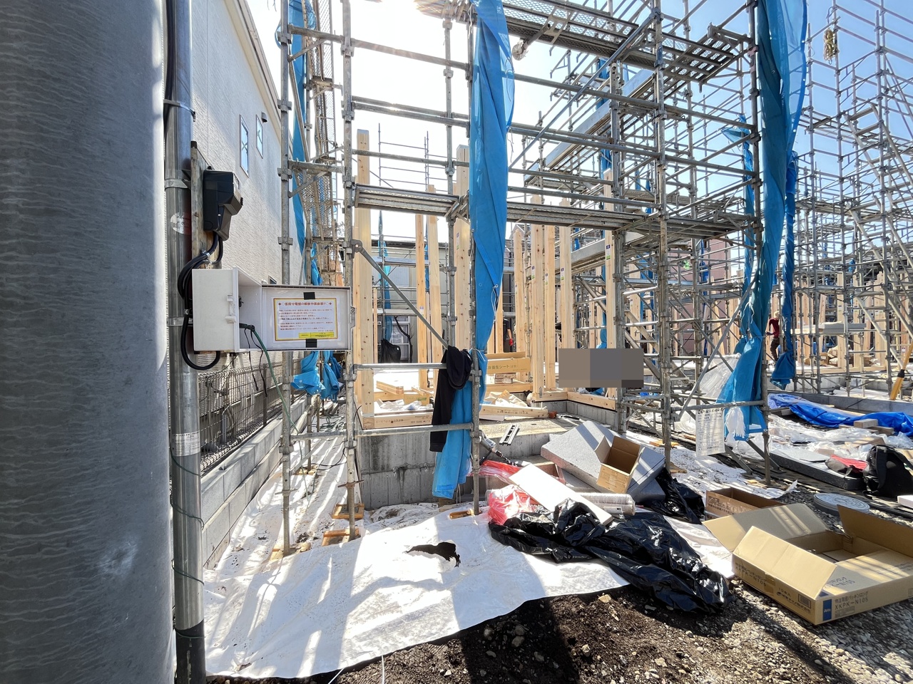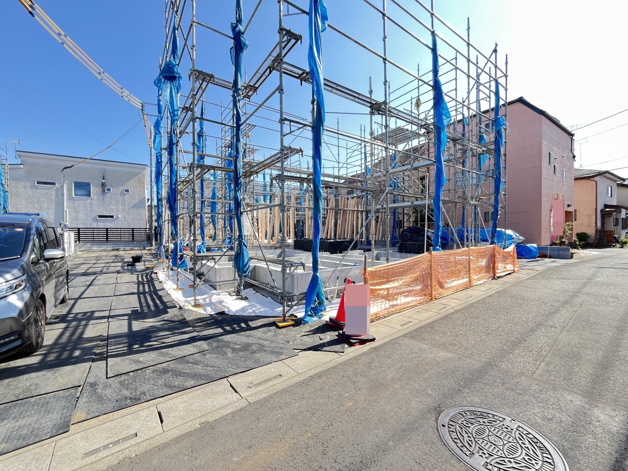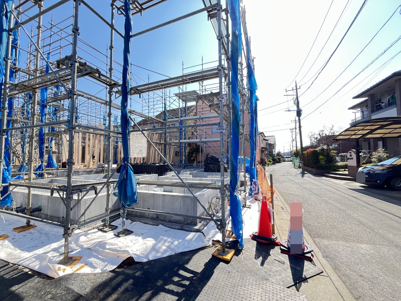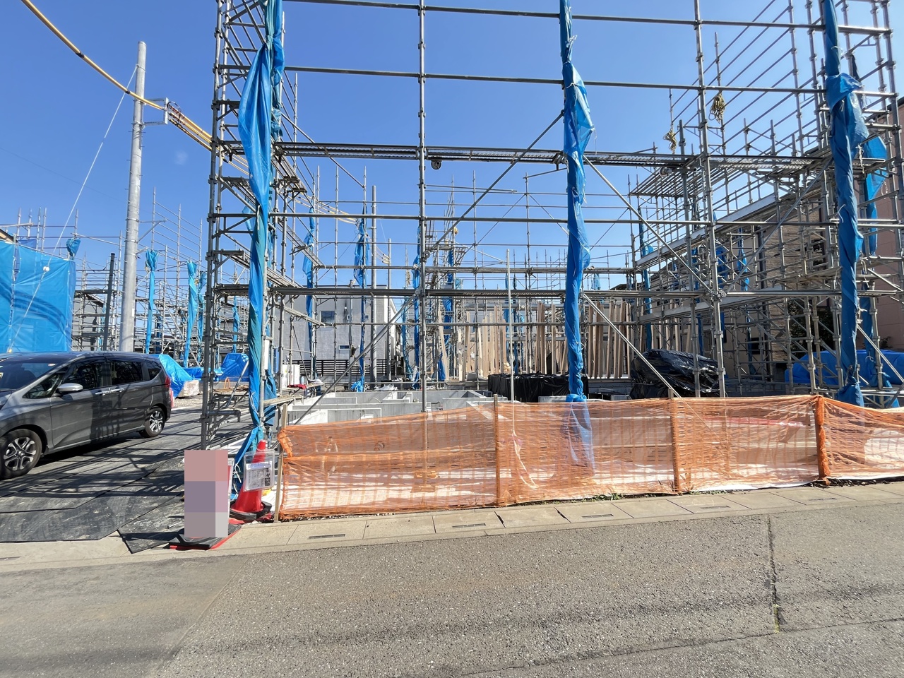 5号棟 青いシートに包まれた躯体が、これから暮らしを育む物語の始まりを静かに告げています。安全に配慮された敷地には、確かな技術と未来への想いが息づいています 2026/04/03m